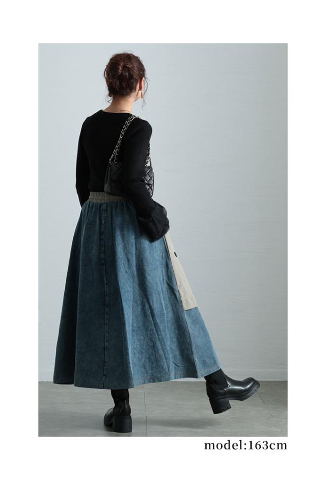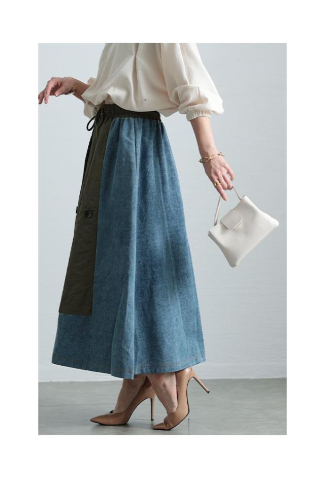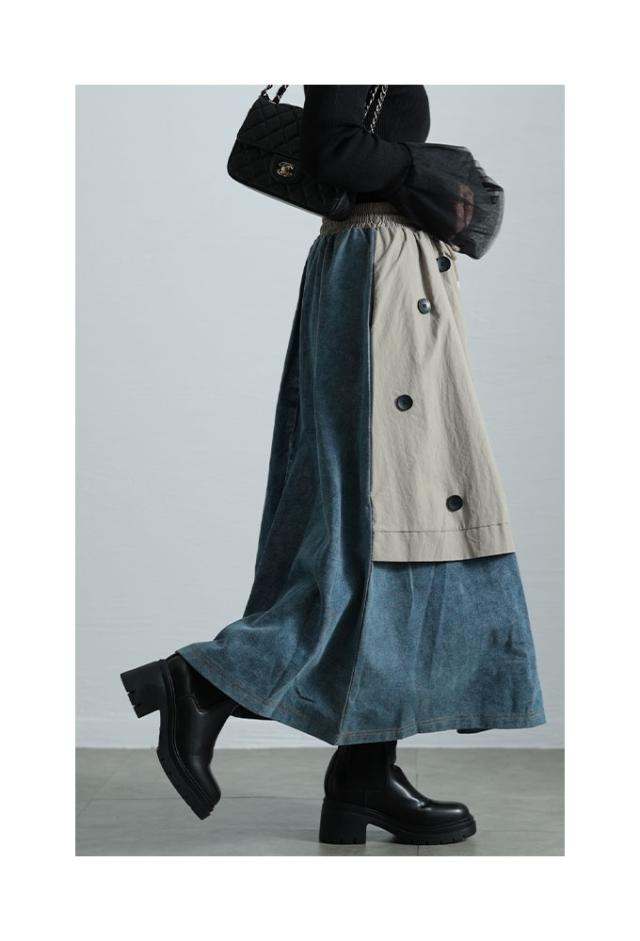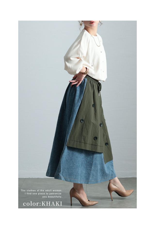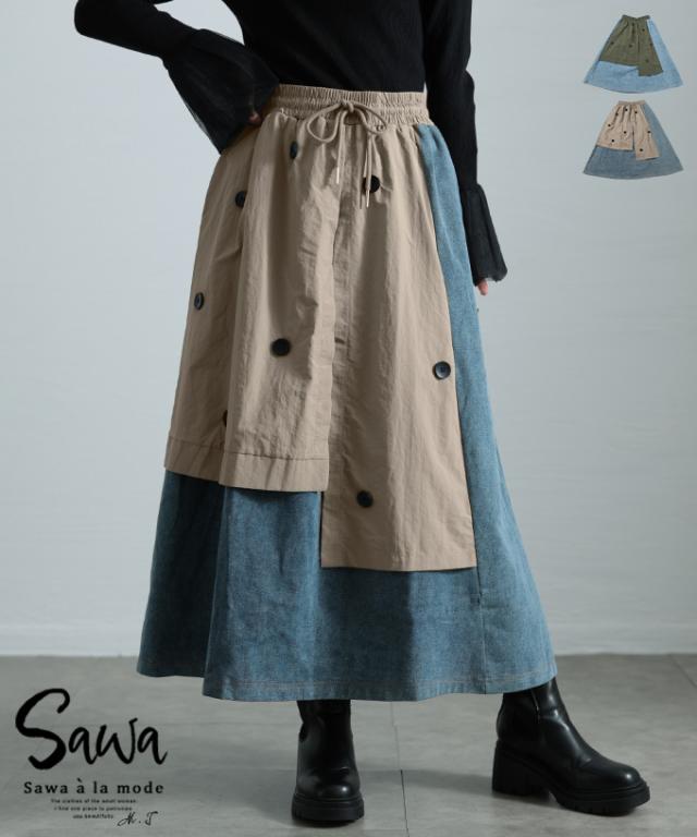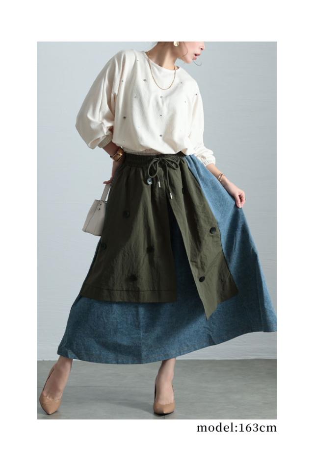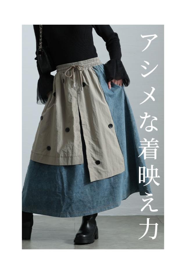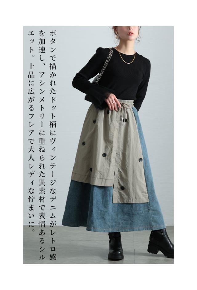春新作 レトロに遊ぶモード感異素材デニムスカート レディース ファッション スカート 異素材 デニム ドット ウエストゴム ドロスト 配色 レイヤード 無地 30代 40代 50代 60代 サワアラモード sawaalamode otona 大人 cawaii 可愛い 洋服 かわいい服 sawa-9810