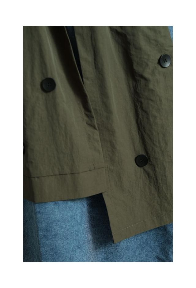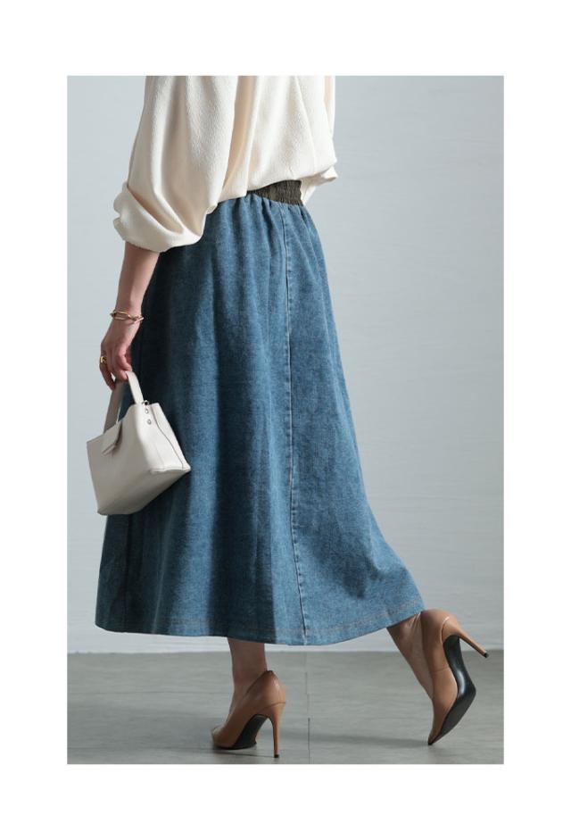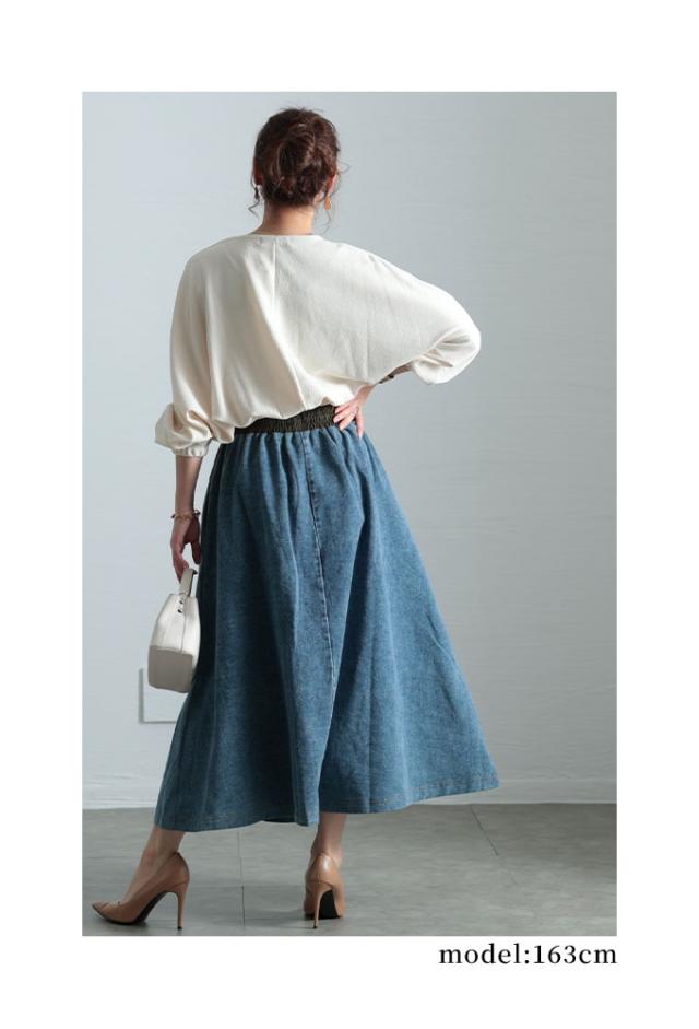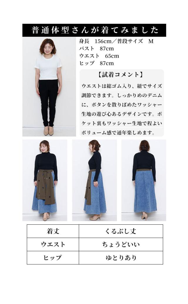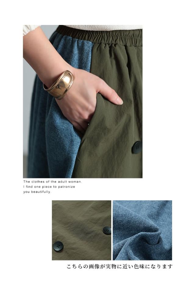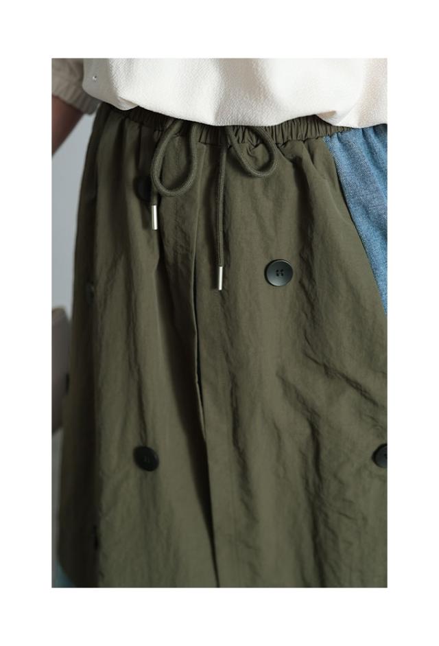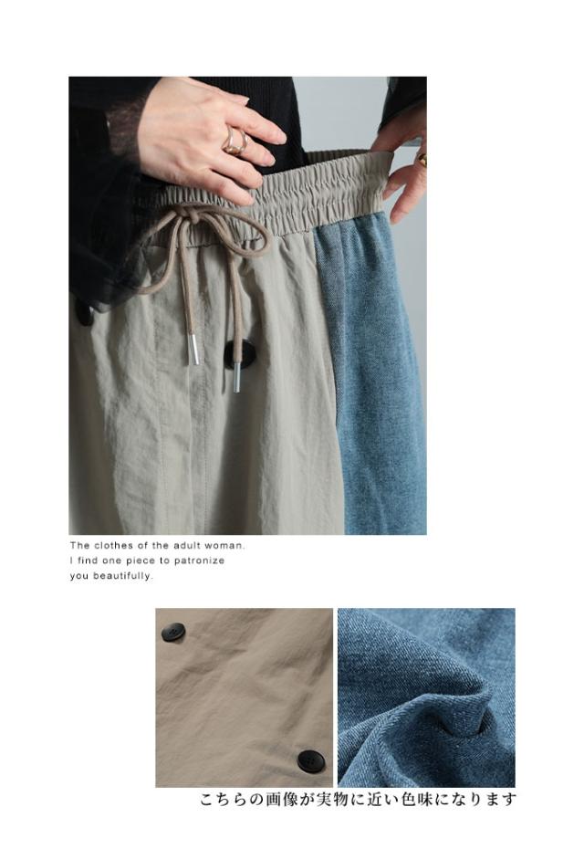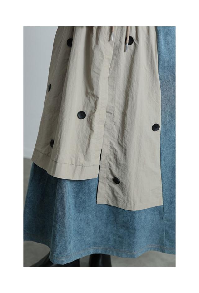 スカート丈はくるぶし丈、ウエストは総ゴム入り、紐が通っているのでサイズ調節できます。洗いをかけたしっかりめのデニム地に、アシンメトリーで大きめボタンを散りばめたワッシャー生地を重ねた、遊び心あるデザインです。両サイドポケット付きで、ポケット裏もワッシャー生地です。程よいボリューム感で、オールシーズン活躍してくれそうです。
