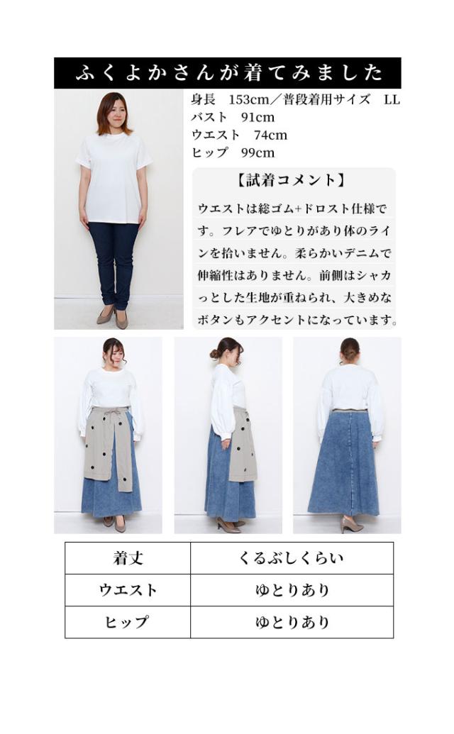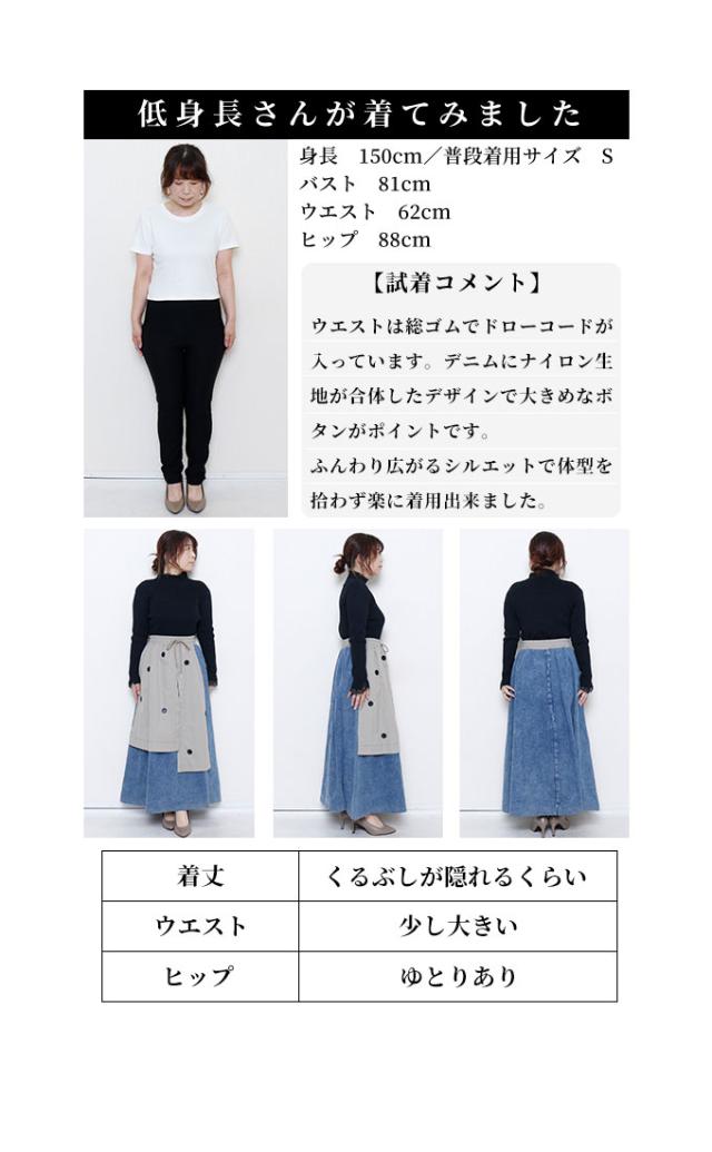 着丈はくるぶしが隠れるくらいです。ウエストは総ゴムでドローコードがあるので自分に合ったサイズで着用出来ました。全体的に私には少し大きいサイズ感でした。デニムにナイロン生地が合体したデザインで大きめなボタンがポイントです。ふんわり広がるシルエットで体型を拾わず楽に着用出来ました。