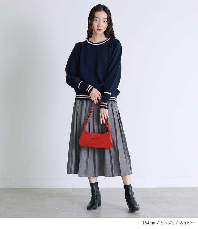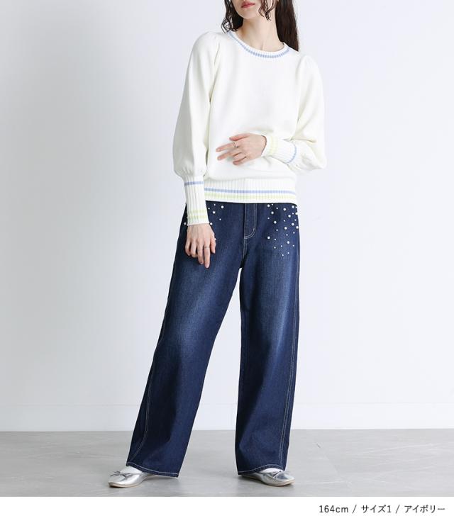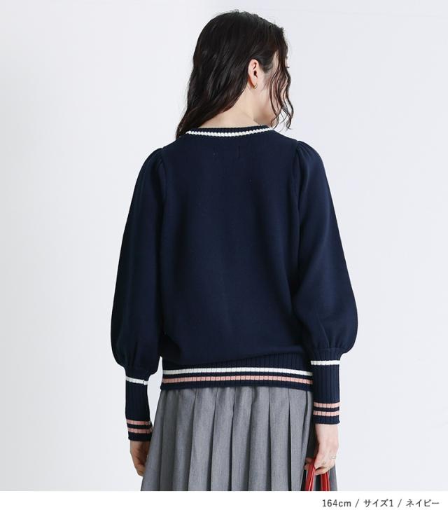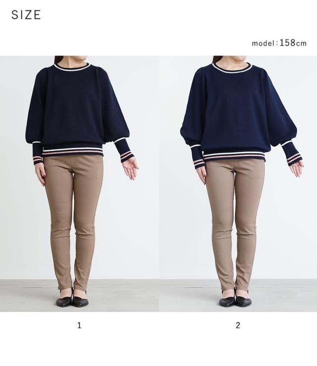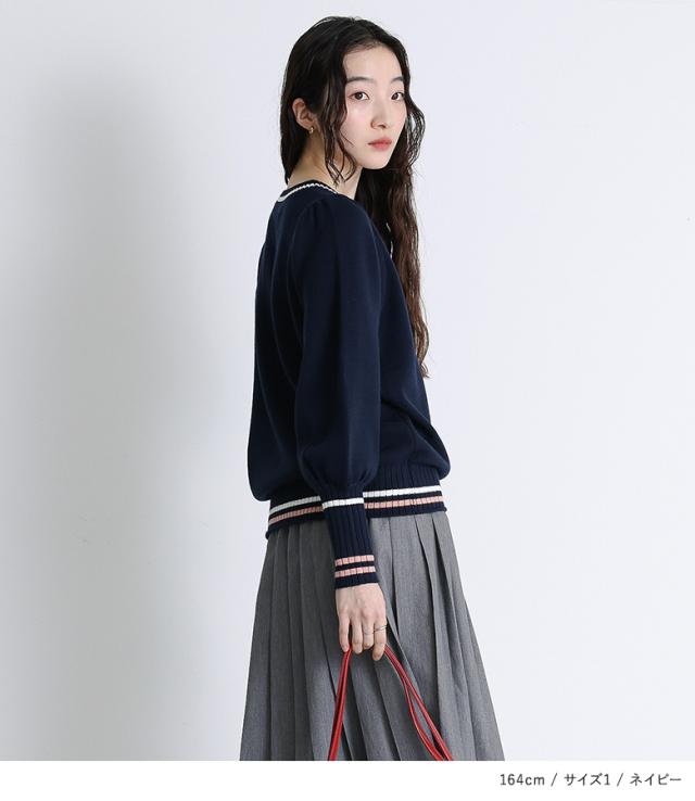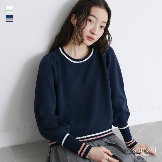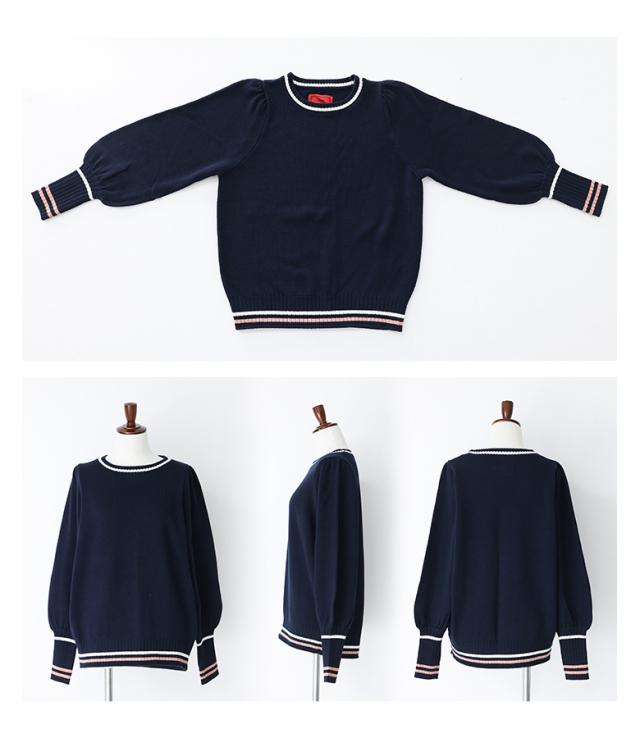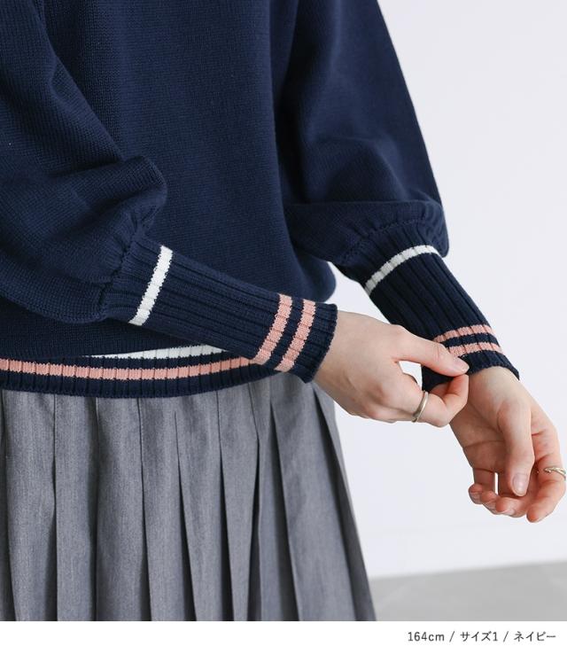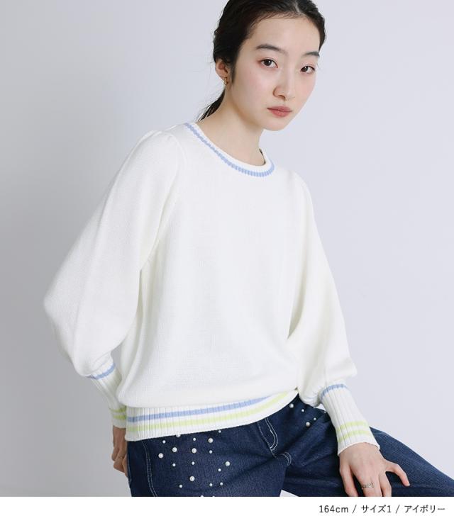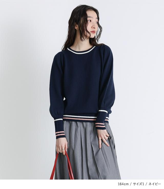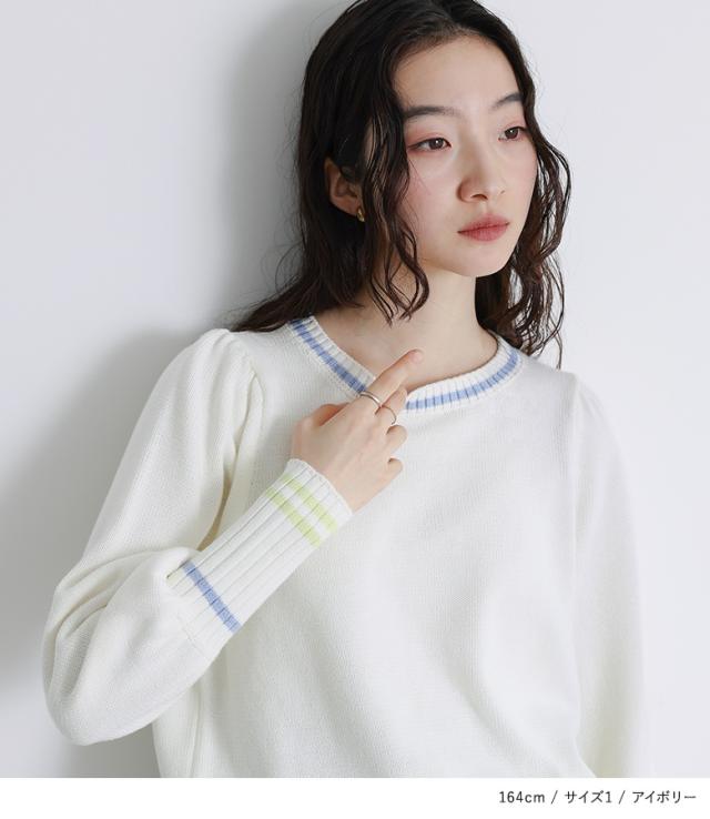 『配色ラインパフスリーブニット』【メール便不可】【30】[ニット レディース トップス セーター 長袖 クルーネック 配色 ライン 綿混 パフスリーブ ロングリブ 春 秋 冬]