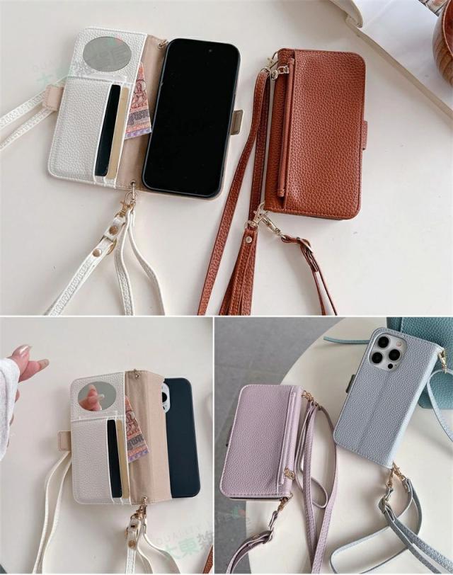 ファスナー/ミラー/2つストラップ付き iPhone16 iPhone15 ケース ショルダー コインケース RFID スキミング防止 iPhoneケース アイフォンケース 16 15 14 13 12 Pro Max Plus 手帳型 スマホケース おしゃれ 大人 可愛い かわいい スタンド 財布 手帳型ショルダー ミラー付き