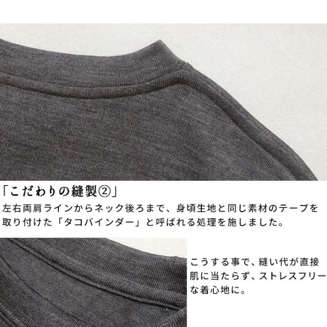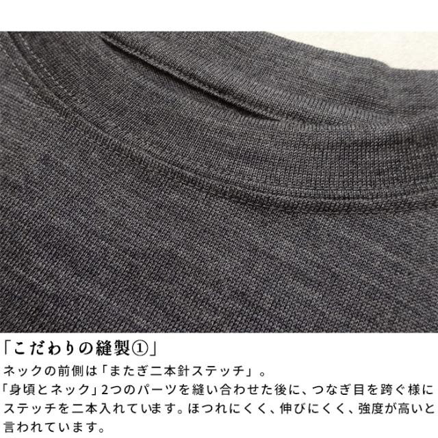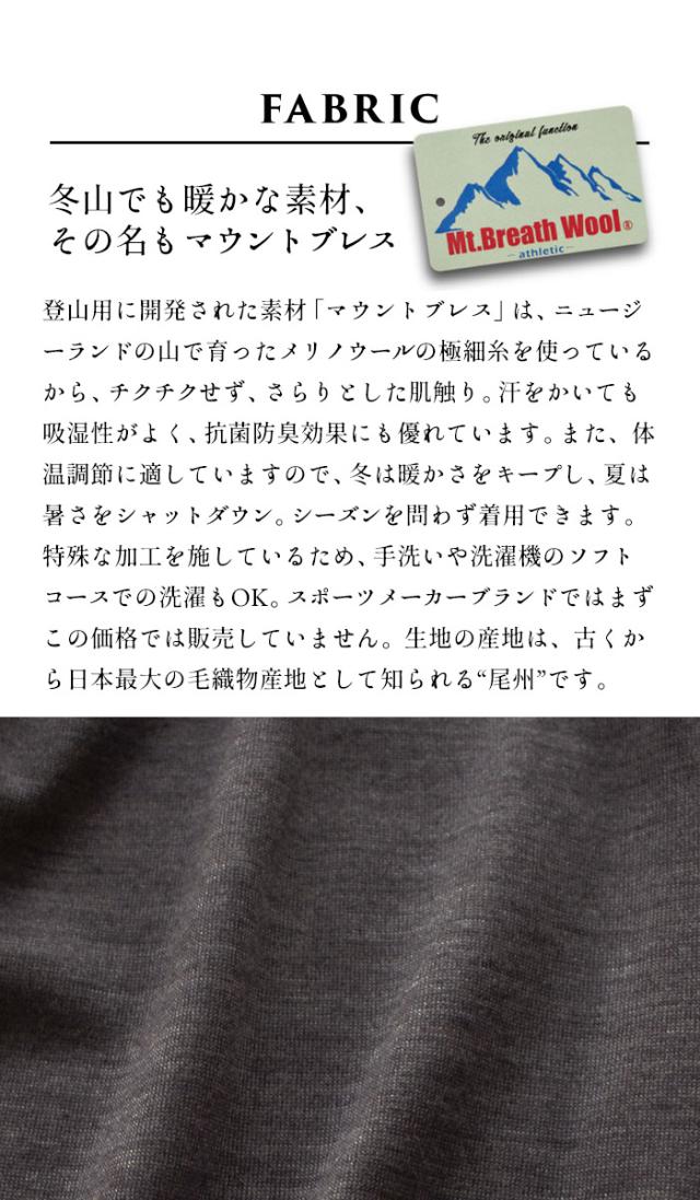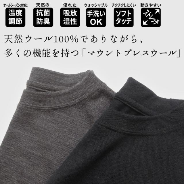 特徴 天然ウールでありながら、多くの機能を持つ「マウントブレスウール」温度調整、抗菌防臭、吸放湿性、手洗いOK、ソフトタッチ、ストレッチ。冬のインナーとして好評のマウントブレスウールから、待望のメンズアイテム登場。ゆったりめのつくりで、インナーとしても、一枚着としても着ていただける様、細かなディテールに拘りつくした一枚です。一度着用すると、やめられなくなる程の、快適な着心地をお試しください。