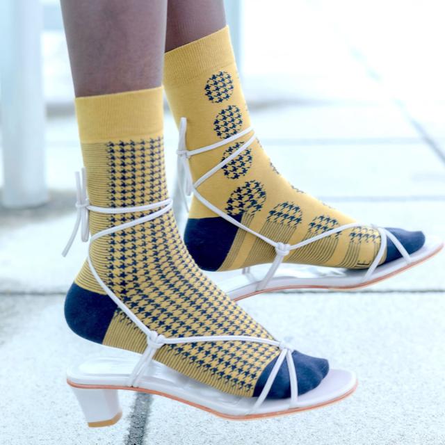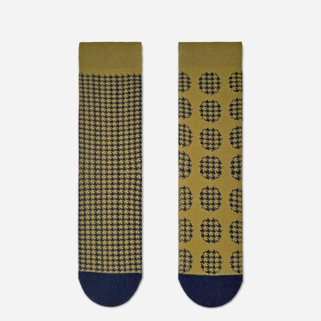 一般的なハウンドトゥース柄とは一線を画す、左右非対称のソックスです。