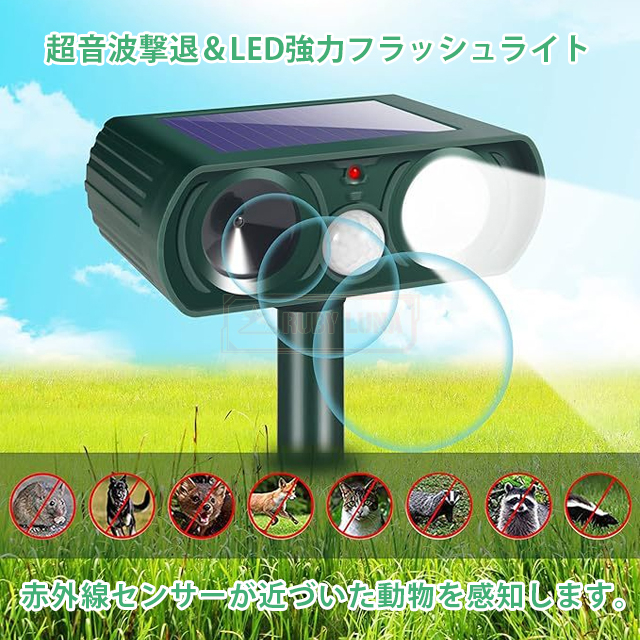 | 【動物撃退器駆除原理】 | ◆範囲が広くなり、より多様な動物に対応でき、撃退効果も向上しています。動物を検知すると、超音波スピーカーから動物が嫌がる超音波を発生させます。動物は機械に慣れる習性がありますが、本製品は自動周波数制御の超音波を使用することで、動物が慣れるのを防ぎます。動物を傷つけずに追い払うことができるリペラーです。 |