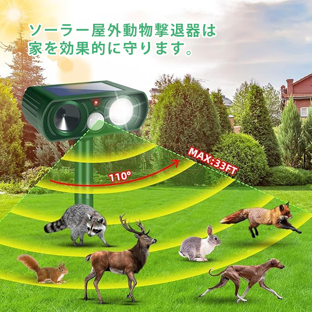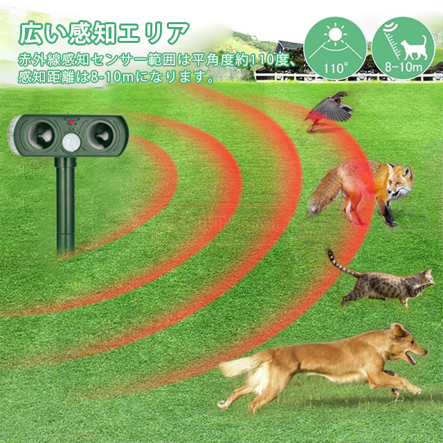 | 【赤外線自動感知・広い感知エリア】 | ◆赤外線自動感知で害獣などを感知。動物が検出範囲に入る時、赤外線センサーで超音波スピーカーをトリガーし、音、警報。猫、鳥、犬、ネズミ、キツネ、アライグマ、その他の動物を追い払う。この動物駆除器は、家の周りの環境を破壊から守ることができ、動物を追い払うのに最適です。こちらの動物撃退器は感知エリアが広くて、赤外線自動感知センサー範囲は平角度約110度、感知距離の最大直径約8m-11mになります。注意:使用環境、動物の大きさ、天気、製品の電量などによって、感知範囲に多少誤差があります。 |