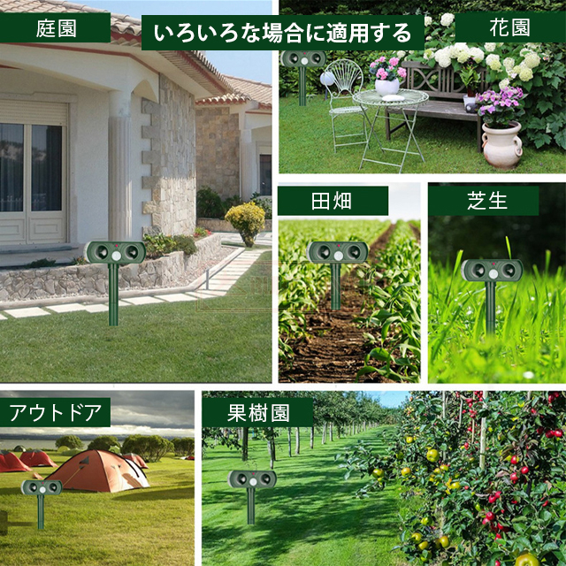 | 【幅広い適用場所】 | ◆動物撃退器超音波周波数範囲は25-61KHzまでで、動物によって嫌いな周波数の音域が異なるため、動物撃退器から出る周波数の幅を変えることで、より多種類の動物を撃退できるということです。ネズミ、モグラ、ドブネズミ、犬、猫、コウモリ、鳥、キツネ、アライグマ、ノイシシ、イタチなどの動物が撃退できます。 |