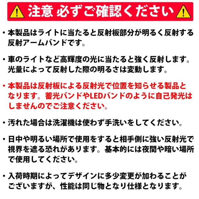 ・本製品は反射板による反射光で位置を知らせる製品となります。蓄光バンドやLEDバンドのように自己発光はしませんのでご注意ください。