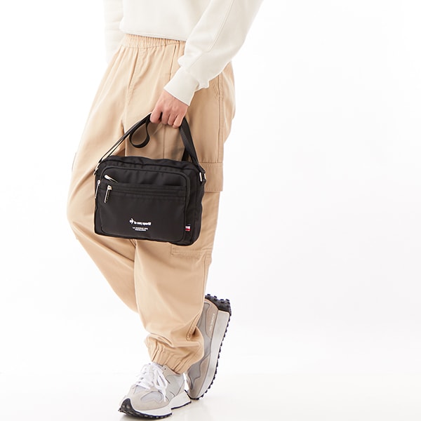 スポーツブランド<ルコックスポルティフ>のミニショルダーバッグです。軽量で撥水機能のあるポリエステルを使用。突然の雨も安心。外側4つ、内側3つ、合計7ポケットでしっかり仕分け収納。ちょっとしたお出掛け、お買い物やお散歩にピッタリのサイズ感。シンプルデザインなので男女兼用で使えます。