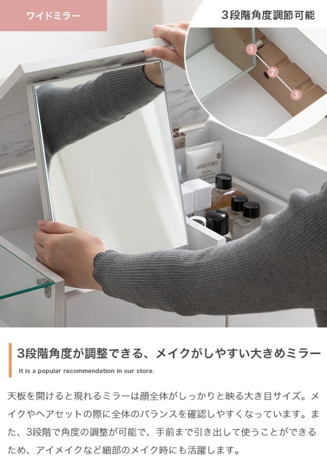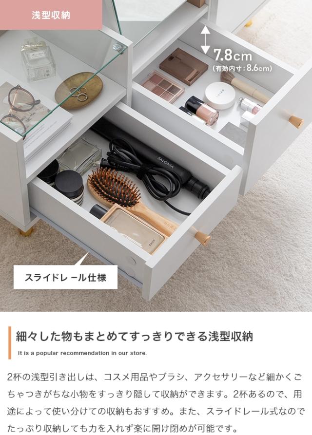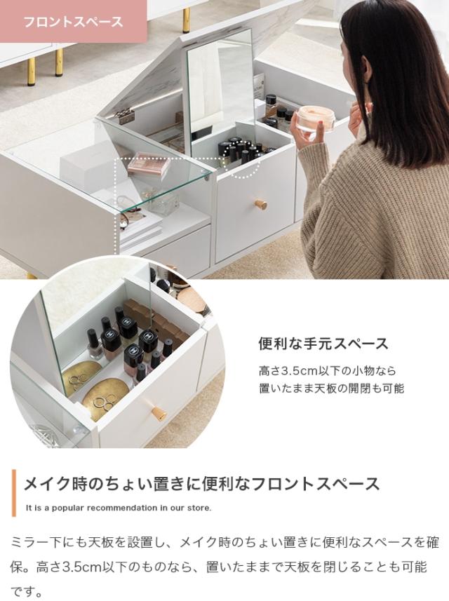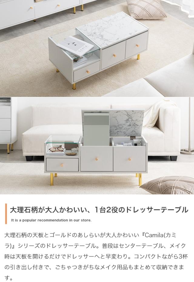 | 説明 | 天板の大理石柄とゴールドのあしらいが特徴の『Camila(カミラ)』シリーズのドレッサーテーブル。普段はセンターテーブル、天板を開けるとドレッサーになる1台2役の省スペースなサイズ感は、1人暮らしやワンルームにもぴったりです。深さの異なる3つの引き出しと、ガラスの美しいディスプレイ収納付きで、ごちゃつきがちなメイク用品もスマートに整理できます。 |