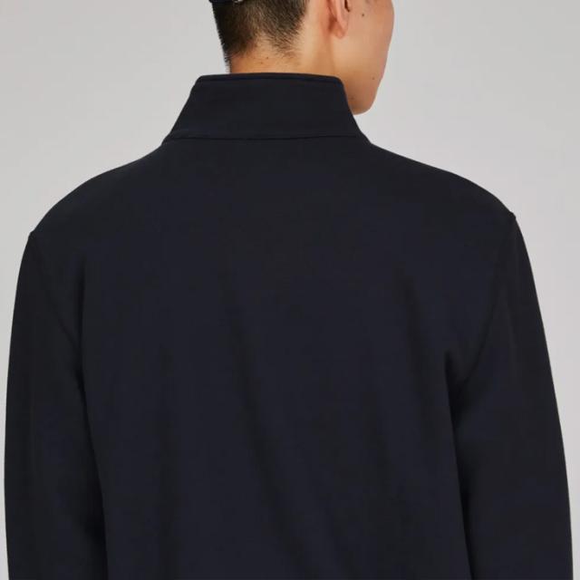 リサイクルポリエステルをブレンドした裏毛素材のハーフジップスウェットシャツです。