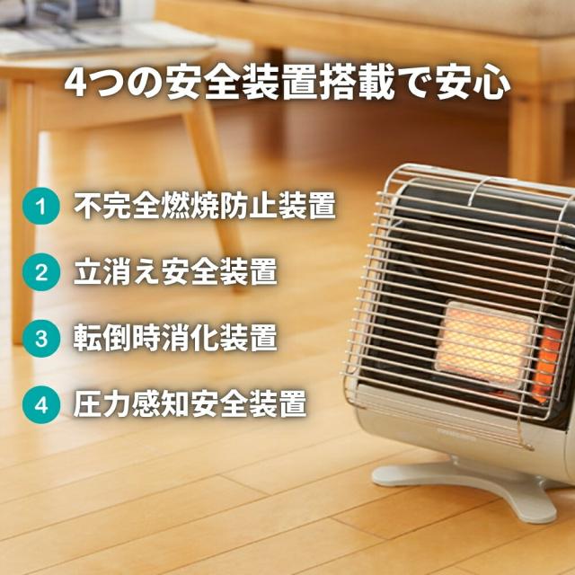 ・安全装置:不完全燃焼防止装置、立消え安全装置、転倒時消火装置、圧力感知安全装置
