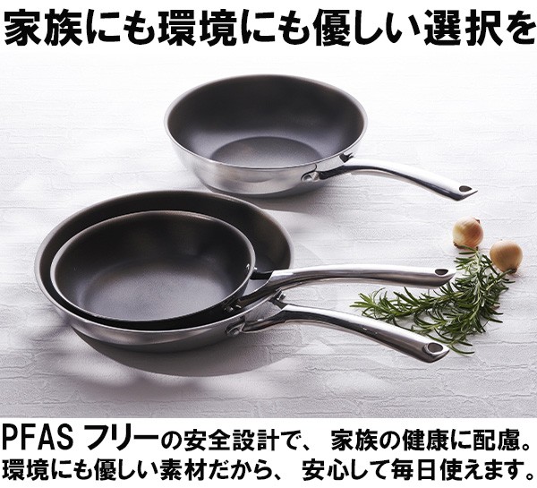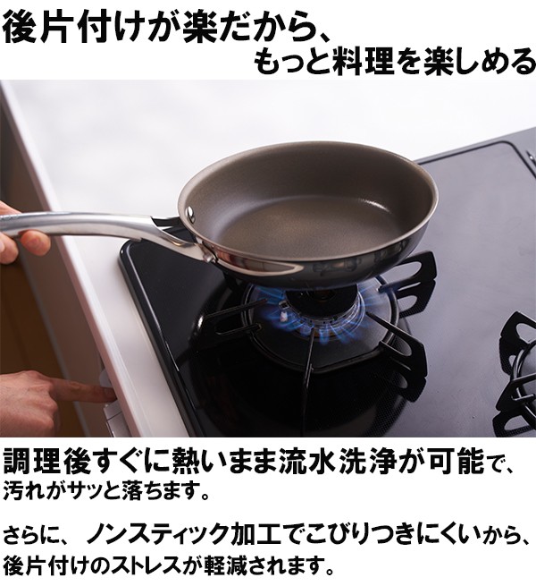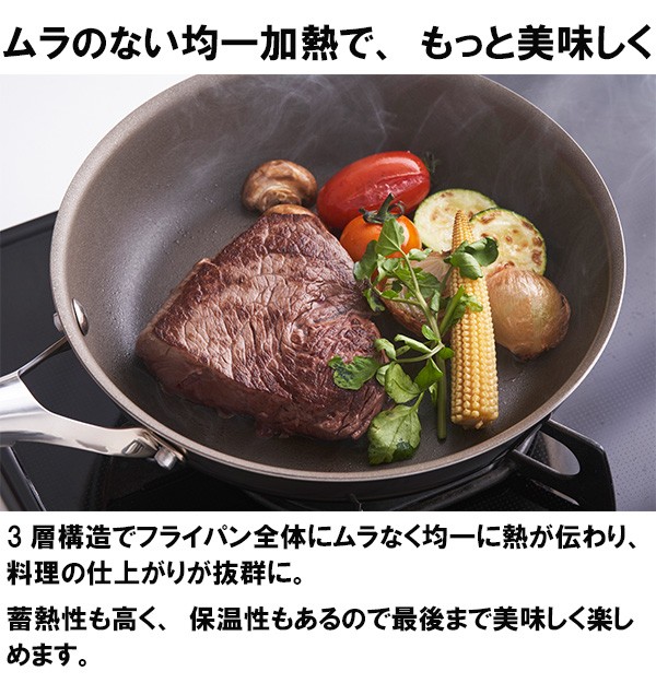 フライパンの材質はステンレス+アルミ+ステンレスの3層鋼。