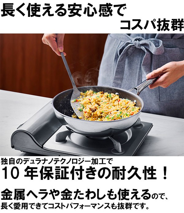 DuraNanoテクノロジーはフライパンの板に金属の粉末を溶接しているため、接着剤も使用しておらず剥がれ等が一切起きない製法。また、金属の粉末は硬度が固いため削れたり、傷が付くこともありません。