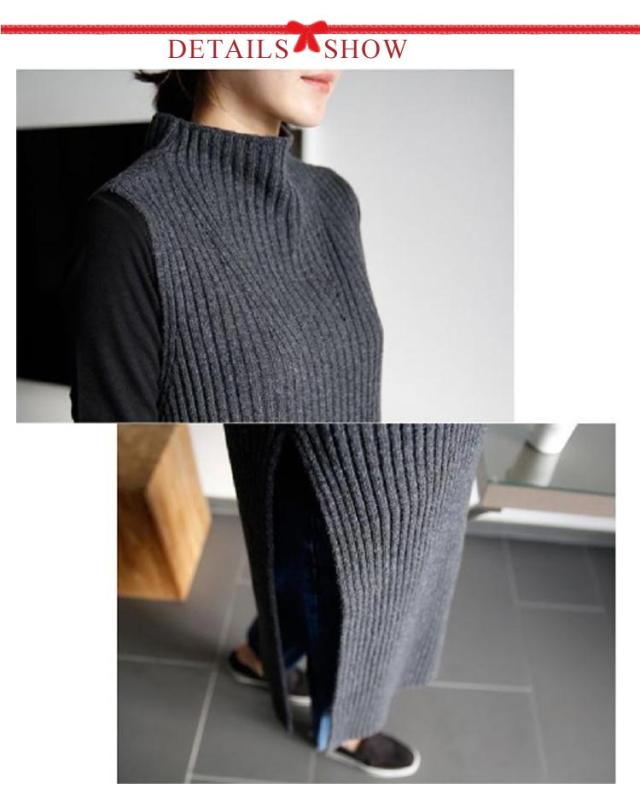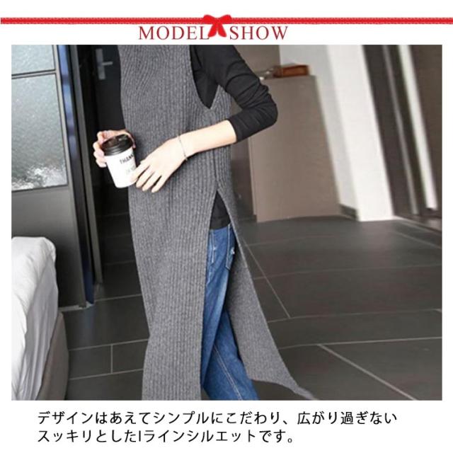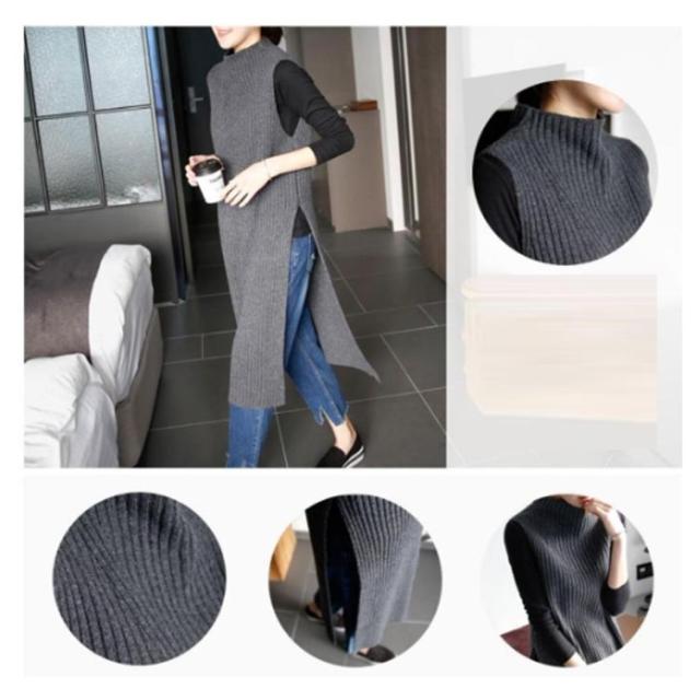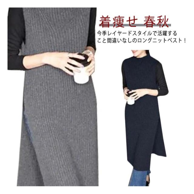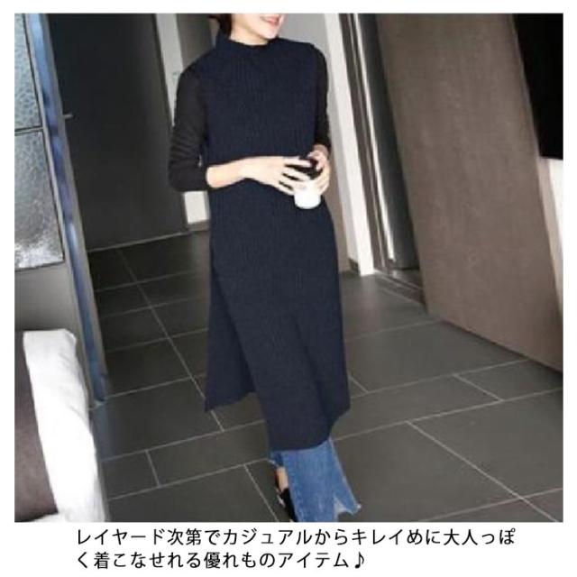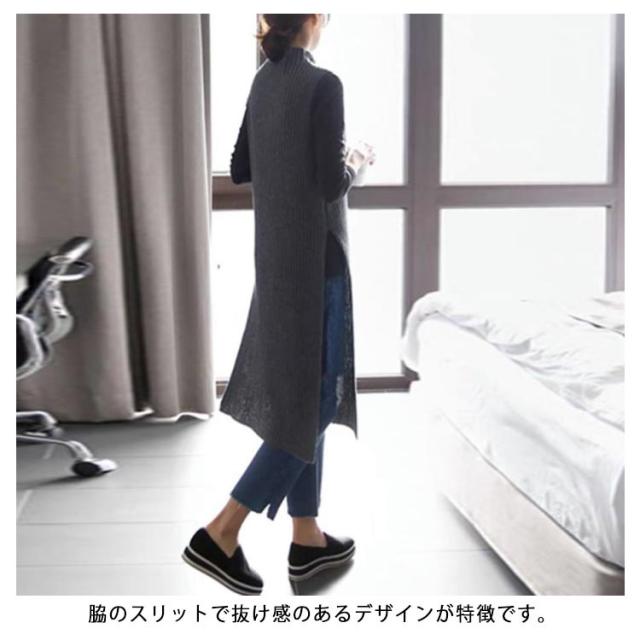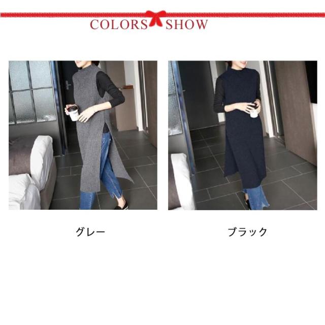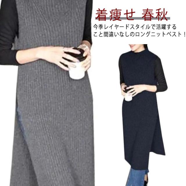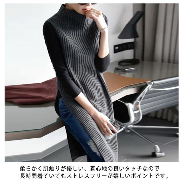 レイヤード スリット入り ニット ロング丈 ハイネック フリーサイズ ワンピース ニットベスト チュニック オフィス カジュアル ノースリーブ ニットベスト 女性 体型カバー レディース 着痩せ 大人 お洒落 重ね着 キレイめ 無地 シンプル