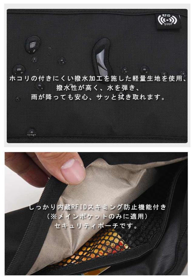 | セキュリティポーチ コンパクトなのにたっぷり入る収納力! しっかり内蔵RFIDスキミング防止機能付き(※メインポケットのみに適用)セキュリティポーチです。 海外旅行でのパスポートなどの貴重品管理には気を使いますよね。 磁場、電波を通さない素材を使用しているので、電子パスポートやクレジットカードに記録されている個人情報をスキミングからしっかりと守ります。 ホコリの付きにくい撥水加工を施した軽量生地を使用、撥水性が高く、水を弾き、雨が降っても安心、サッと拭き取れます。 。調整可能なワンタッチバックルで体にフィット感抜群。 ウエストのベルト調整をしやすくて、長さを調節すれば斜め掛けのボディバッグとしても。 | |