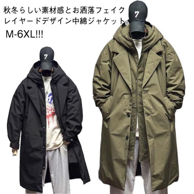 中綿ジャケット フェイクレイヤード おしゃれ かっこいい フード 中綿ブルゾン アウター 2XL 韓国ファッション 冬服 ロングジャケット 大きいサイズ 防寒 暖かい 秋服 綿入れ カジュアル M L XL 4XL 3XL フェイクレイヤード 5XL