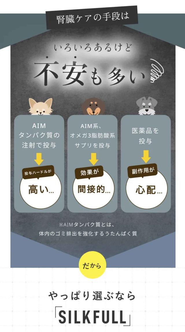 特許技術「高分子量シルクフィブロイン水溶液」を活用した、世界初の犬用の腎臓ケアサプリメントです。