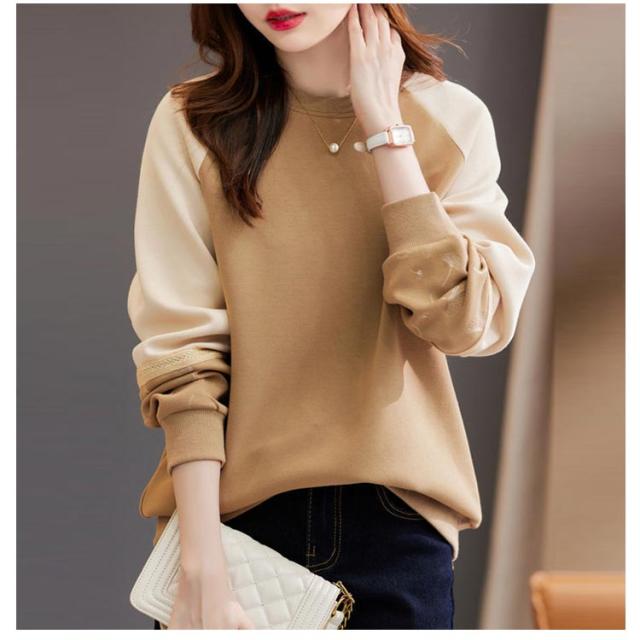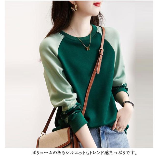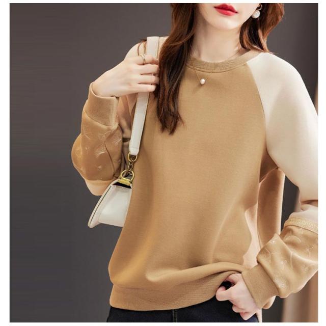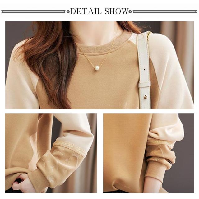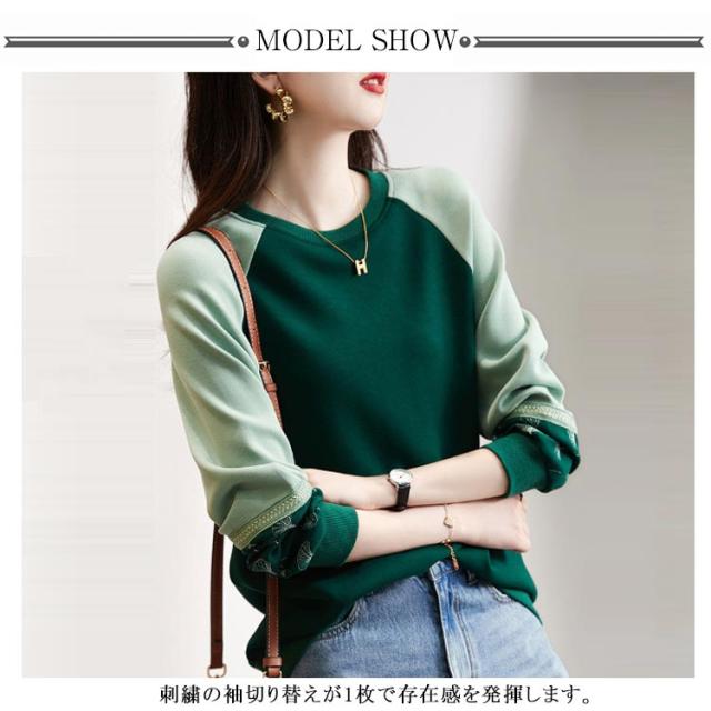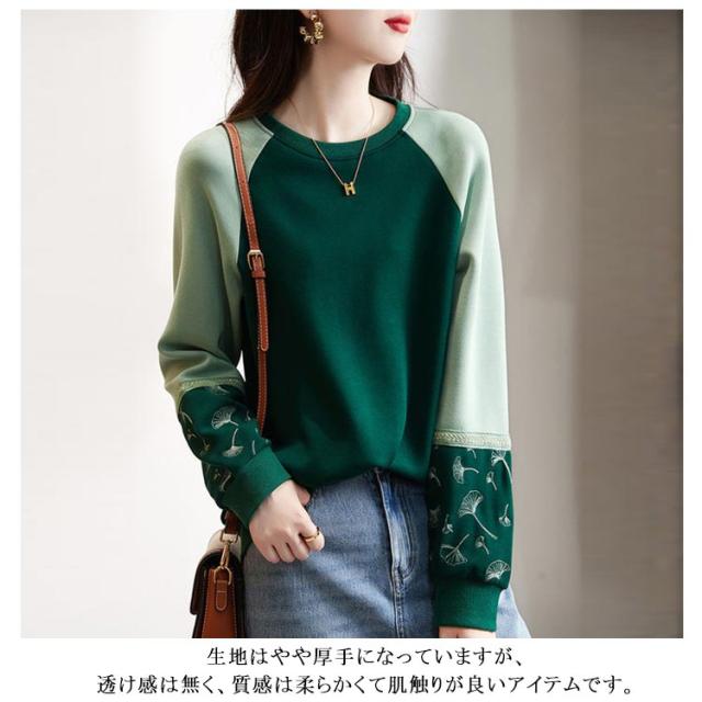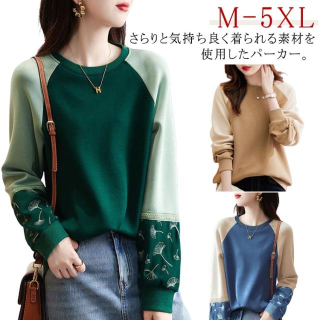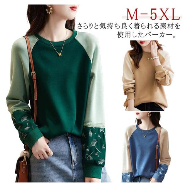 長袖 切り替え レディース レディース 袖 刺繍 春 秋 Tシャツ プルオーバーパーカー トップス ゆったり トレーナー 大きいサイズ かわいい クルーネック きれいめ