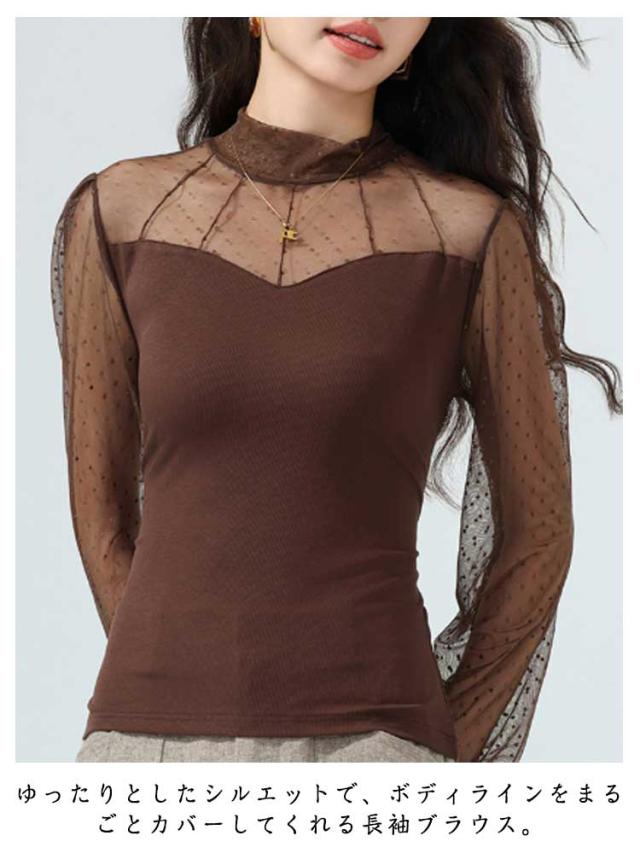 カットソー レースブラウン 秋 総レース レディース シースルー 総レース セクシー レースシャツ インナーウェア tシャツ レース 長袖 カットソー ハイネック レース タイト トップス ブラウス ロンT シースルー おしゃれ メロウ フリル
