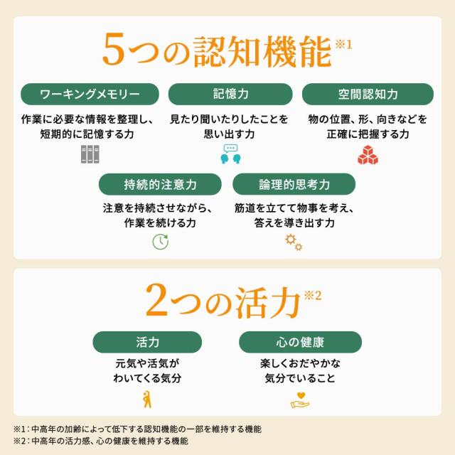 中高年の方の加齢によって低下する認知機能の一部である記憶力、空間認知力、論理的思考力、持続的注意力、ワーキングメモリーおよび中高齢者の活力感、心の健康を維持する機能がある事が報告されています。