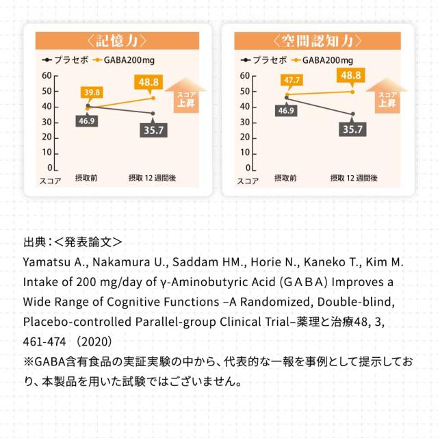 本品にはGABAが含まれています。GABAには中高年の方の加齢によって低下する認知機能の一部である、記憶力(見たり聞いたりしたことを思い出す力)、空間認知力(物の位置、形、向きなどを正確に把握する力)、論理的思考力(筋道を立てて物事を考え、答えを導き出す力)、持続的注意力(注意を持続させながら、作業を続ける力)、ワーキングメモリー(作業に必要な情報を整理し、短期的に記憶する力)を維持する機能、および中高齢者の活力(元気や活気がわいてくる気分)、心の健康(楽しくおだやかな気分でいること)を維持する機能があることが報告されています。