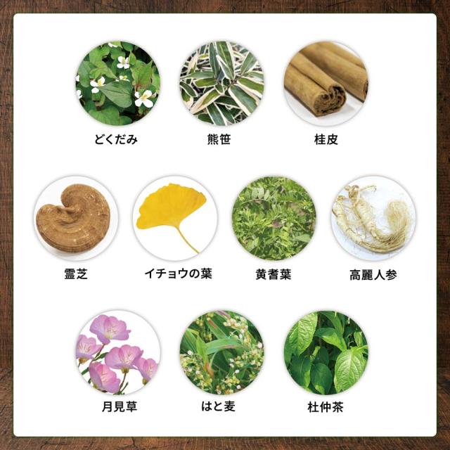 ギャバ含有乳酸菌醗酵エキス(デキストリン、GABA)(国内製造)、はと麦、どくだみ、杜仲葉、霊芝、イチョウの葉、熊笹、月見草、高麗人参、黄耆葉、桂皮