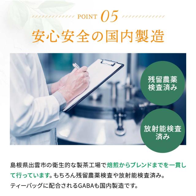サトウキビ由来の原料と食品由来の乳酸菌を使用。安心安全の国内製造の GABA をティーバッグ1個につき200mg配合しました。