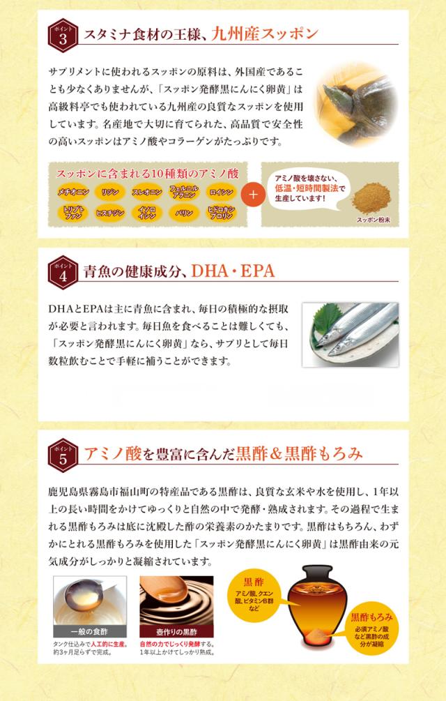 EPA・DHA含有精製魚油、にんにく末、菜種油、食用油脂、発酵黒にんにく末、卵黄油、黒酢もろ味末、すっぽん粉末、米粉、すっぽん卵粉末、黒酢/ゼラチン、グリセリン、ミツロウ、グリセリン脂肪酸エステル、ビタミンE、ビタミンB1