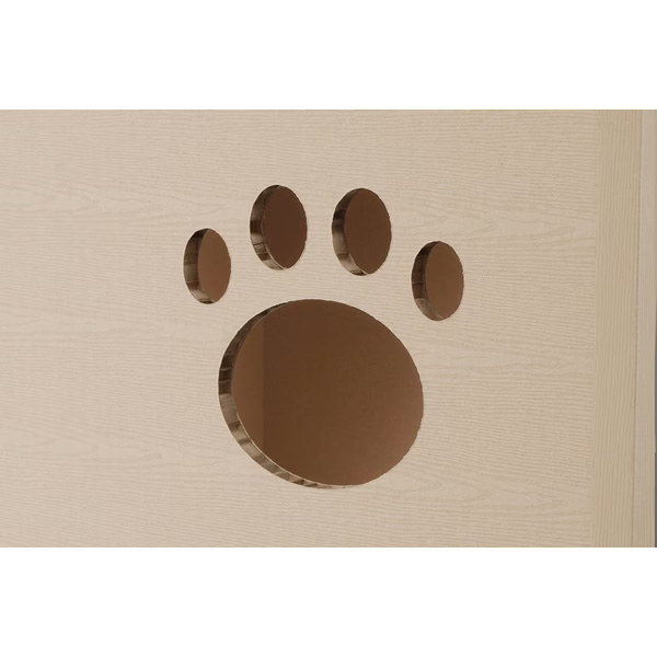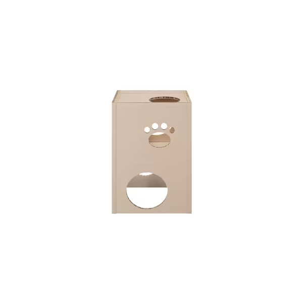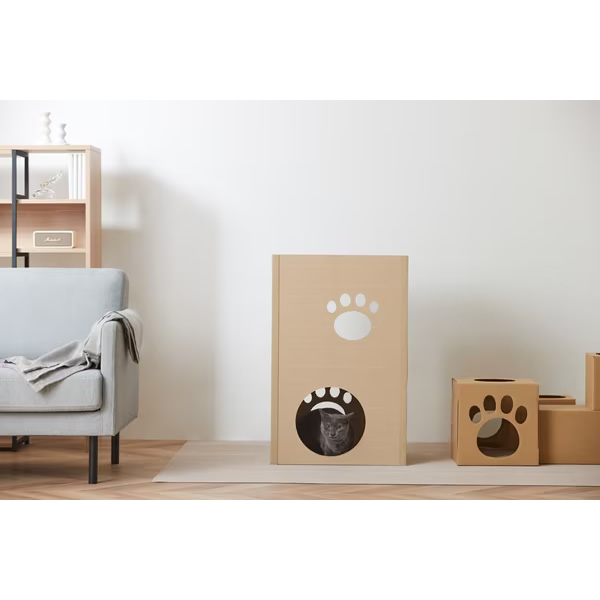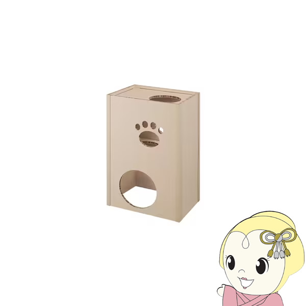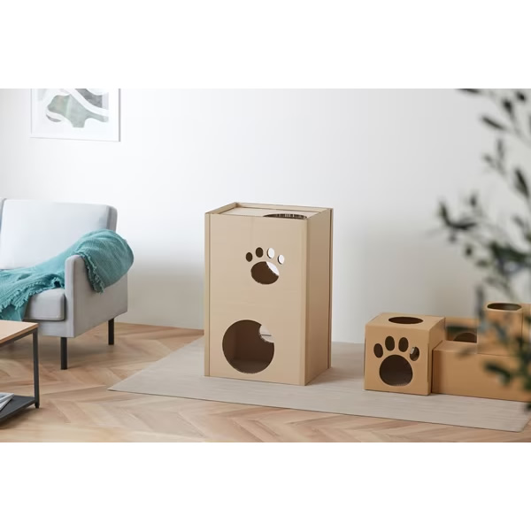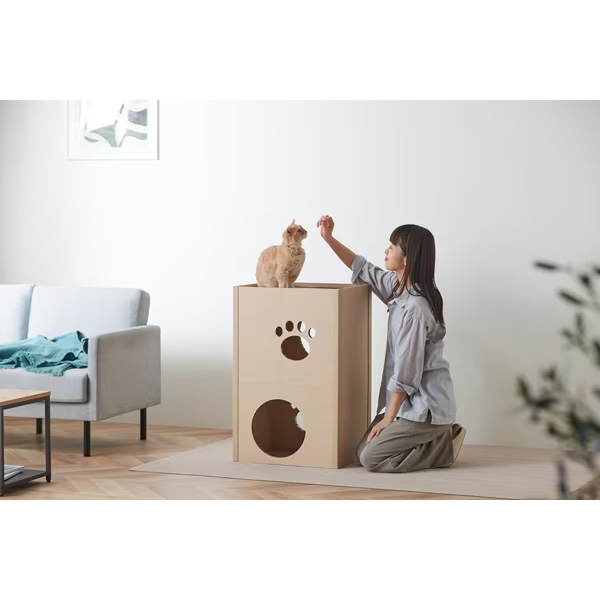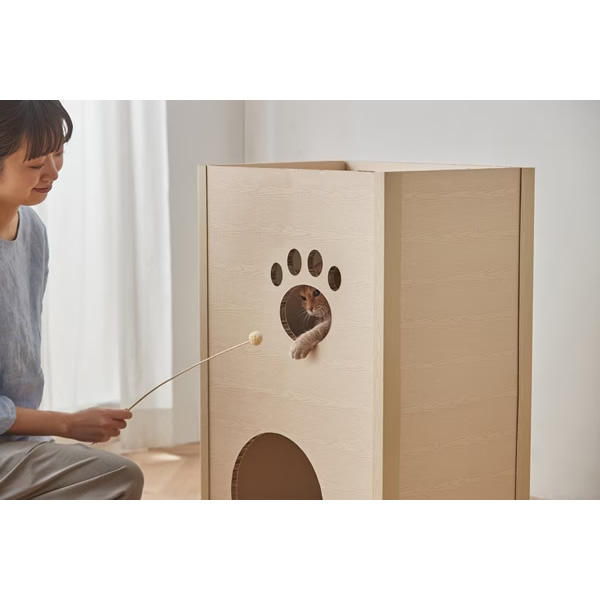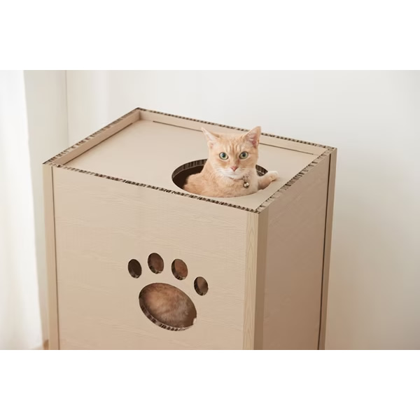 ねこが好きな段ボール素材、強化段ボールを使用したキャットタワーです。一般的な段ボールと比較して、厚さは約3倍、中心はハニカム構造でねこが飛び乗っても安心です。段ボール製で、使用後の処理に困りません。インテリアに馴染む木目調デザインです。かわいらしい肉球形の小窓付きで、ねこの様子も見られます。出入口は側面と天面の2か所です。お客様組み立てとなります。工具を使わず簡単に組み立てができます。