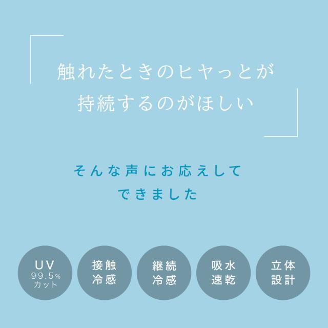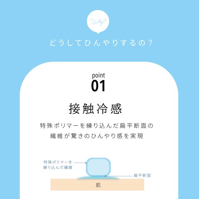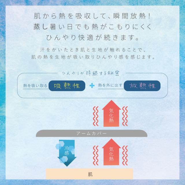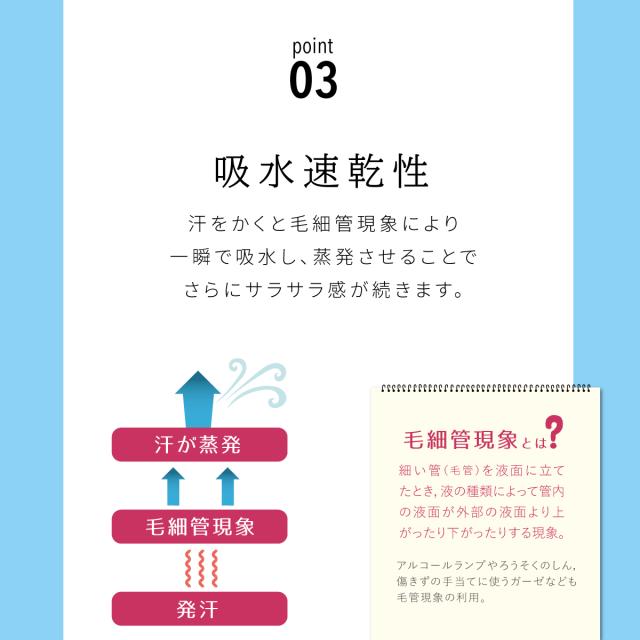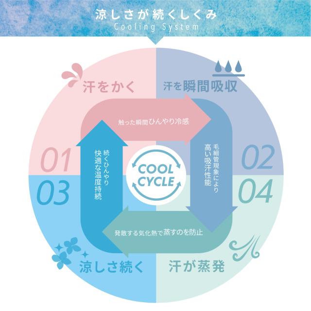 汗をかいたとき、肌と生地が触れることで肌の熱を生地が吸い取りひんやり感を感じます。