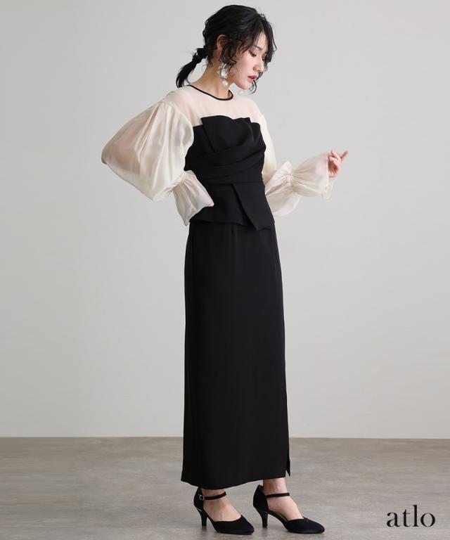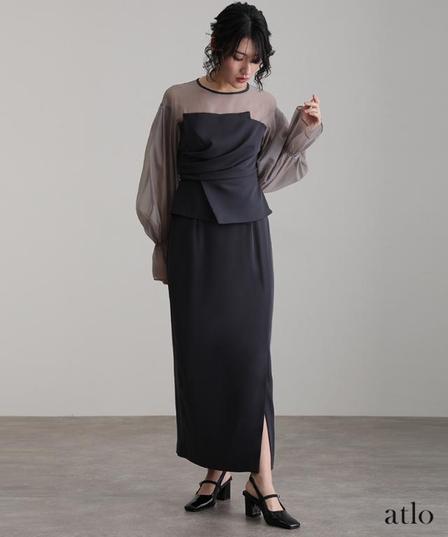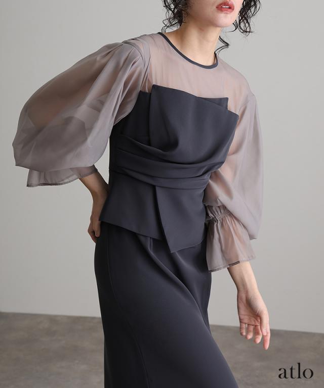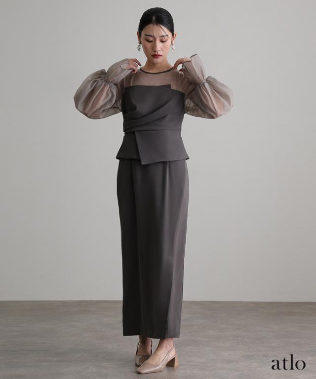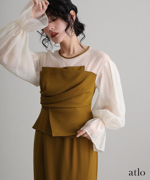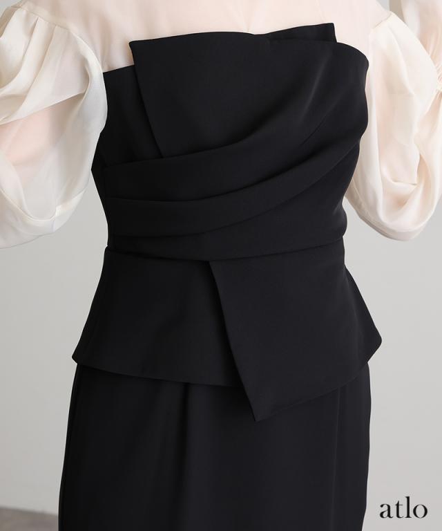 ドレープが加わったビスチェ部分が、個性的でメリハリのあるシルエットを実現。