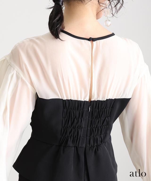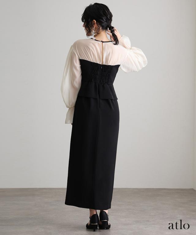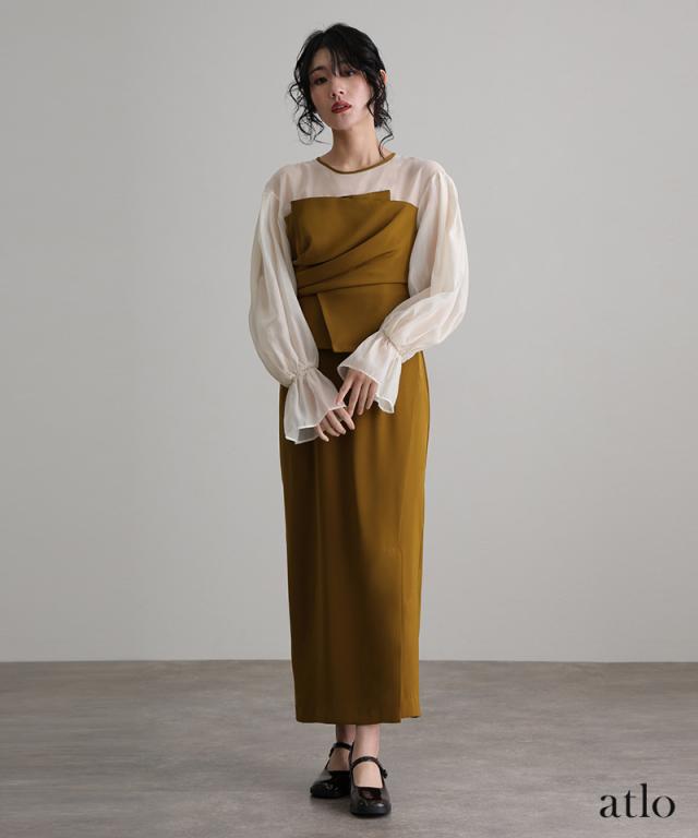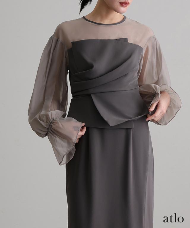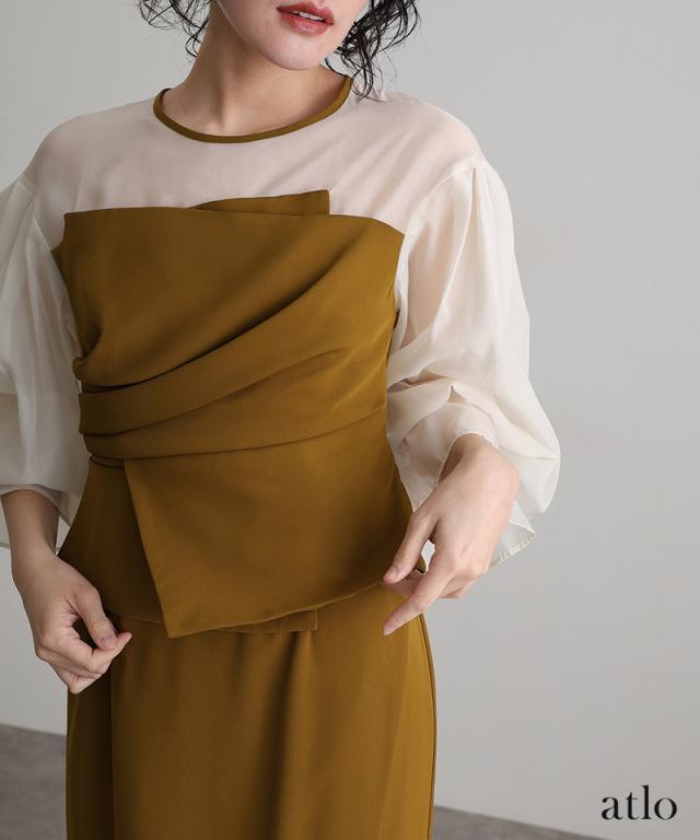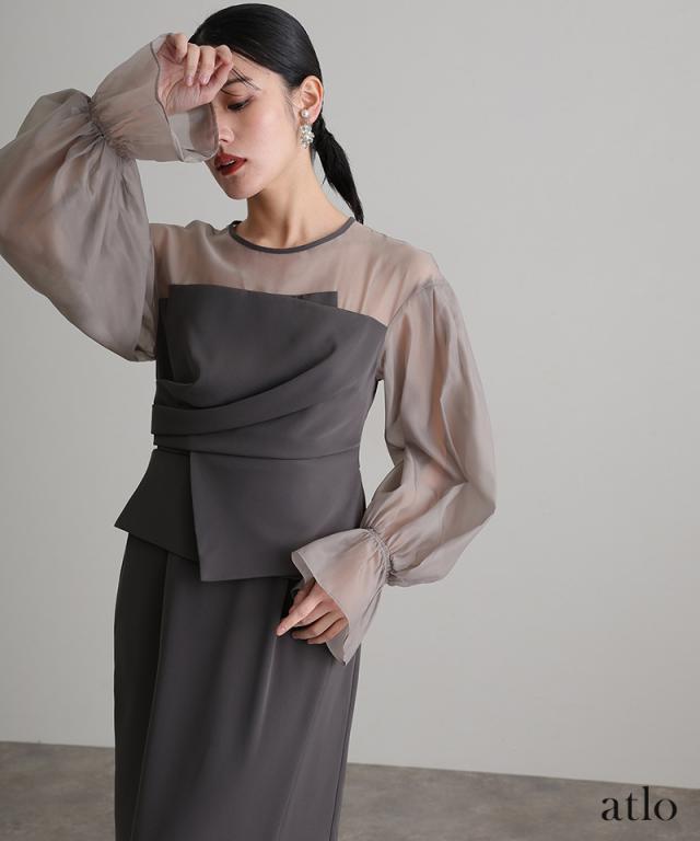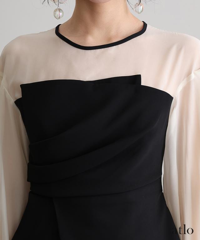 ドレープが加わったビスチェ部分が、個性的でメリハリのあるシルエットを実現。
