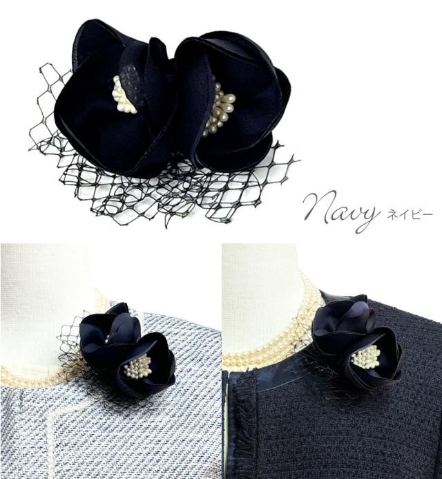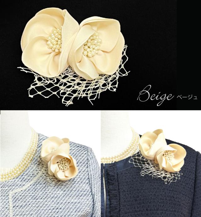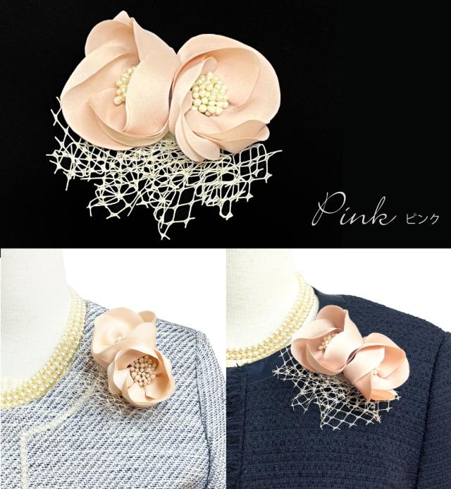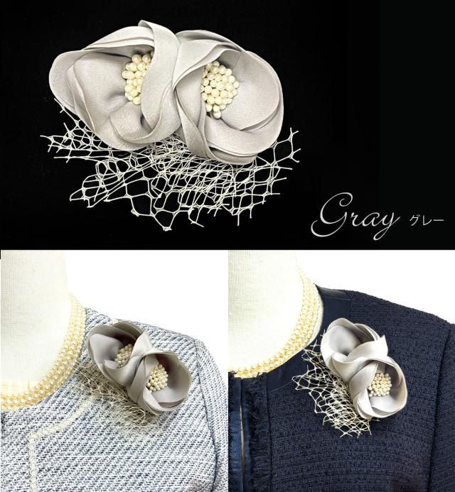 2つのお花モチーフで左右どちらからもお花が見えるツインコサージュです。