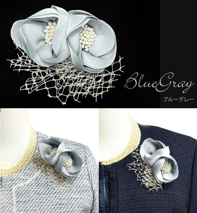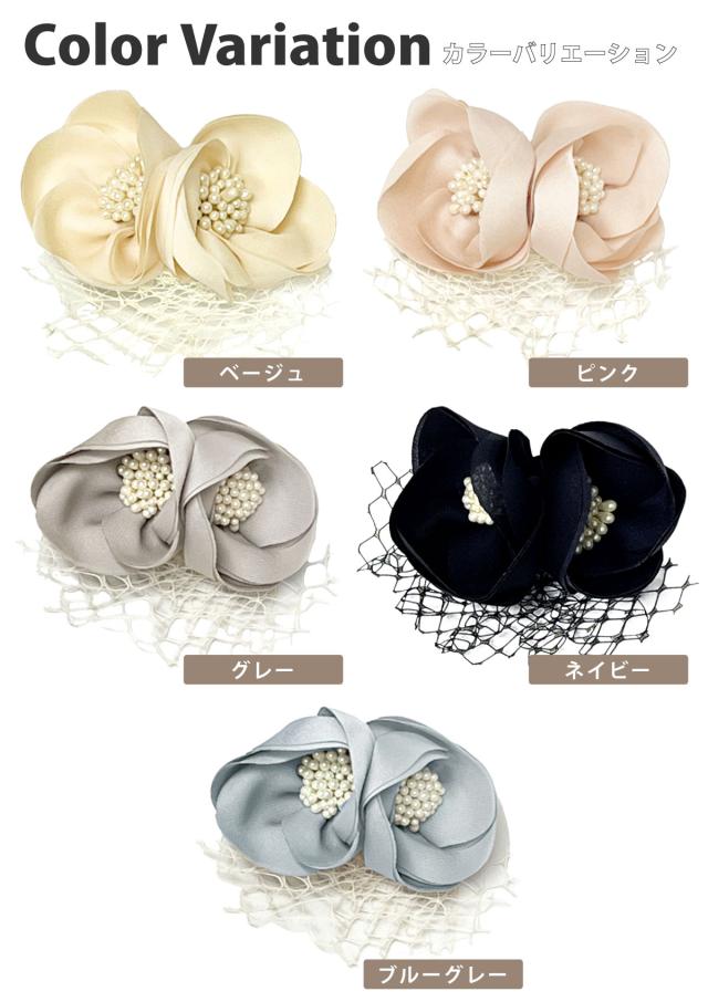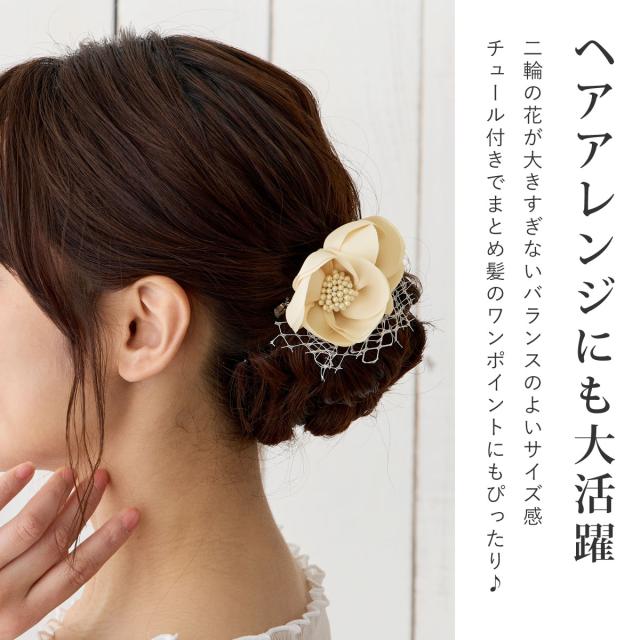 柔らかで丸みのあるお花モチーフに高級感のあるパール花芯とチュール飾りは可憐で上品な印象です。