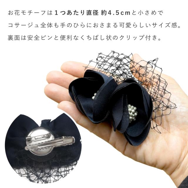 お花モチーフは1つあたり直径約4.5cmと小さめで、コサージュ全体も手のひらに収まる可愛らしいサイズ感です