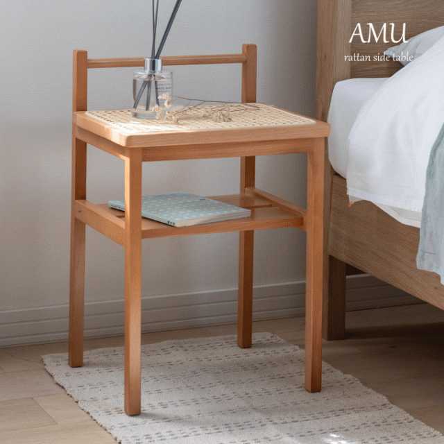 | 天然素材ならではの美しさ・しなやかさがあるラタンを取り入れ、日々の生活とともに変化する様や素材の風合いを楽しめる。 ビーチ材×ラタンの天然素材の組み合わせが可愛らしく、ナチュラルに仕上げました。 ソファやベッドなどのサイドテーブルとして。 また、ものを飾る小さなコンソールテーブルとしても活用できます。 ラタン天板の下には収納スペースになる棚を設けています。 |