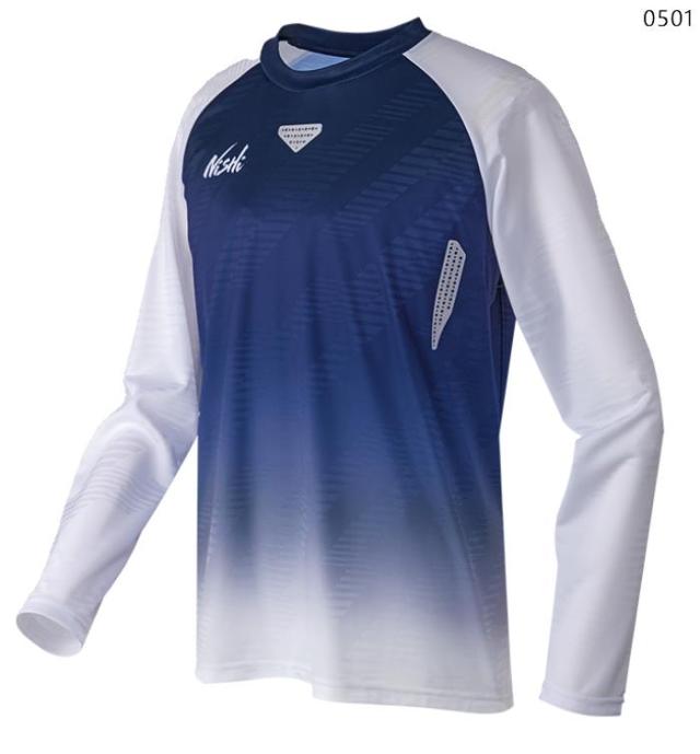 秋〜春先にかけての練習・部活で活躍するロングスリーブタイプ。胸・背・脇に配したエアーダクトホール、吸汗速乾性のある素材などの機能性が、最高のパフォーマンスを目指すアスリートをサポート。ジャカード素材の光沢感と昇華転写プリントによるグラデーションが、シンプルさの中にこだわりを感じさせる、ワンランク上のアスリートのためのデザイン。