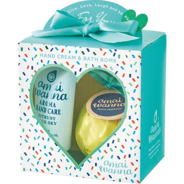 ときめきと誘惑がつまったおやつフレグランスシリーズ、「アマイワナ」。毎日使いたい肌なじみのよいハンドクリームと、シュワシュワ発泡が楽しいバスボムのセット。