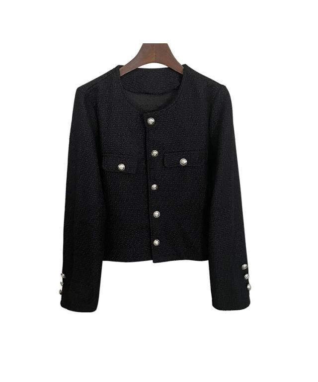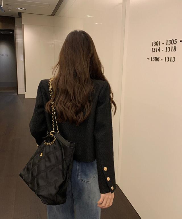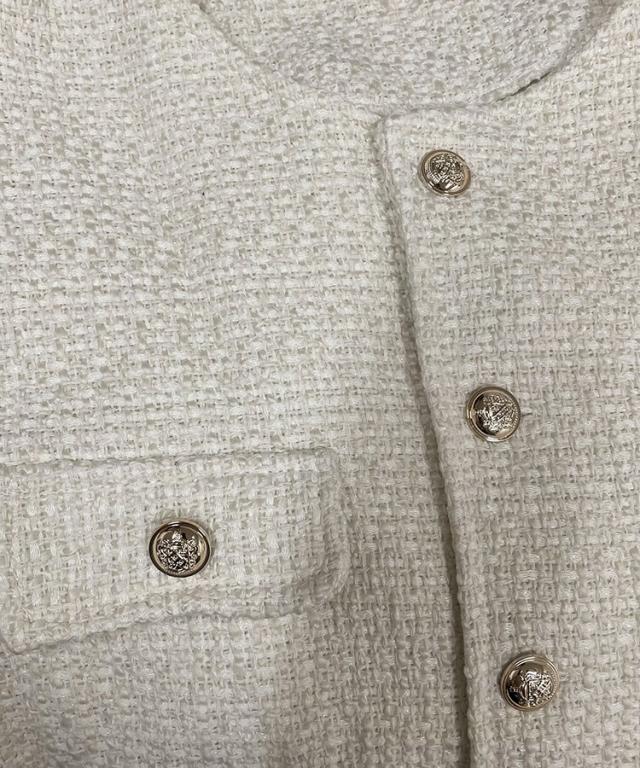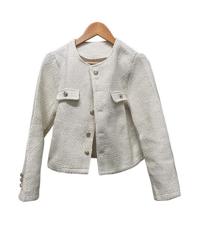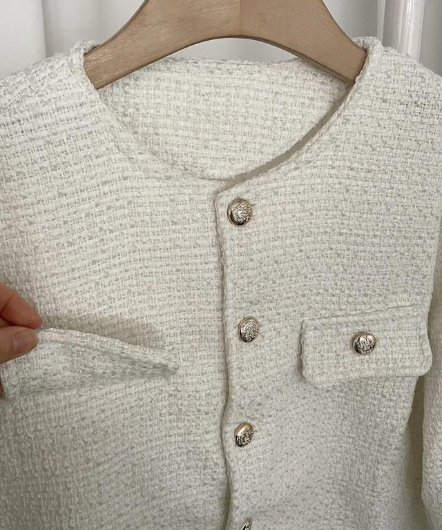 クラシカルなゴールドボタンと柔らかなツイード風素材が、上品さとモダンな魅力をプラス。