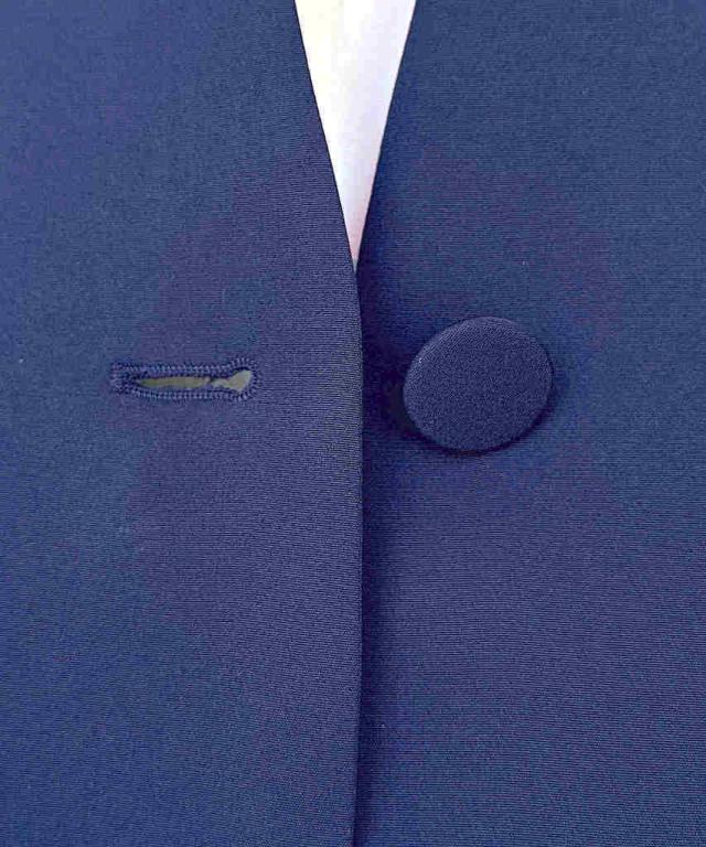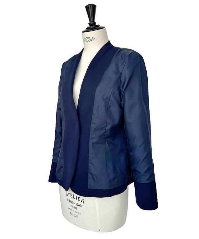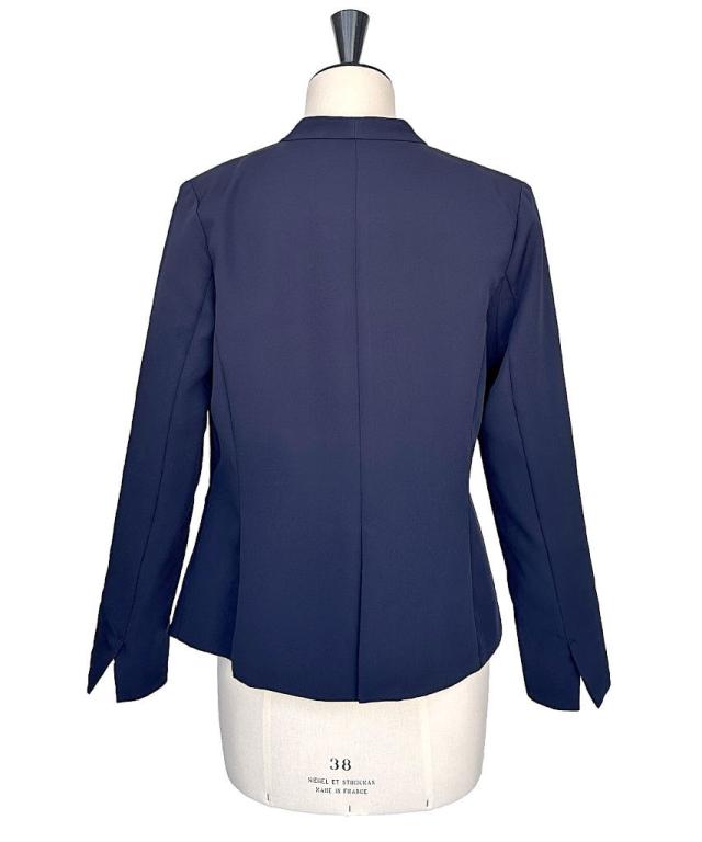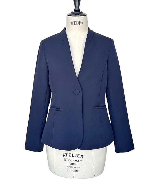 リボンタイや華やかなブラウスもすっきりと着こなせるノーカラージャケット。