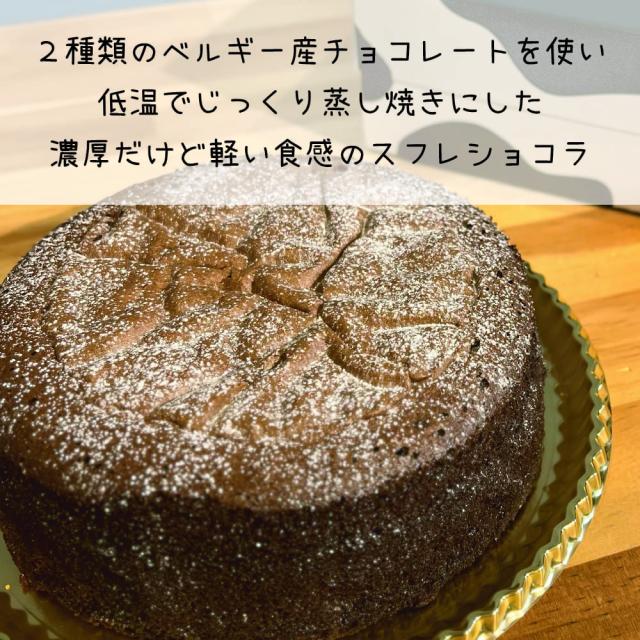 | 商品説明 | ベルギー産のスイートチョコとミルクチョコを使って 低温でじっくり蒸し焼きにした軽い食感のスフレショコラです。 冷蔵庫で冷やしてそのまま食べても美味しいですが 少し温めると、とてもふわふわでさらに美味しくなります。 どちらもぜひ、お試しください。 |