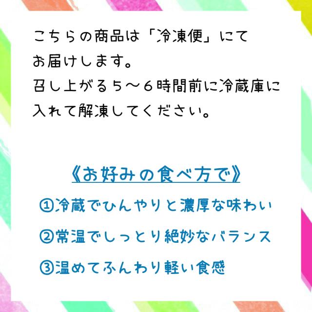 | お召し上がり方 | 《お好みの食べ方で》 1…冷蔵でひんやりと濃厚な味わい 2…常温でしっとり絶妙なバランス 3…レンジで約15秒ほど温めてふんわり軽い食感 |