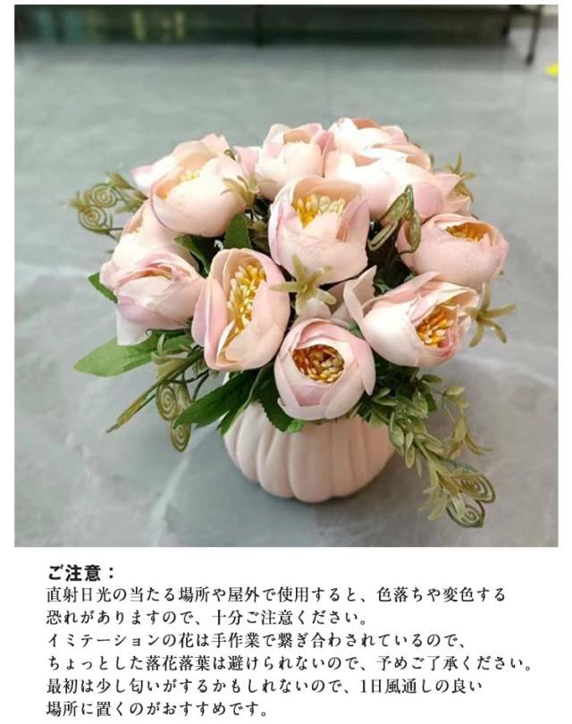 | お部屋に素晴らしく快適な空間を作り出します。飾りつけるだけでお部屋を鮮やかにします。【陶器花瓶付き】 フェイクなので水やりの手間もなく、嫌な害虫が寄り付く心配もありません。 花粉がないので花粉が嫌いな方でも花の美しさが楽しめます! 花びらも葉も鮮明な色で、遠目から見れば、まるで生花のように生き生き咲いています。 花瓶の外観はへこんだデザインで、アート感があり、より立体的に見える。 ご注意: 直射日光の当たる場所や屋外で使用すると、色落ちや変色する恐れがありますので、十分ご注意ください。 イミテーションの花は手作業で繋ぎ合わされているので、ちょっとした落花落葉は避けられないので、予めご了承ください。 最初は少し匂いがするかもしれないので、1日風通しの良い場所に置くのがおすすめです。 | |