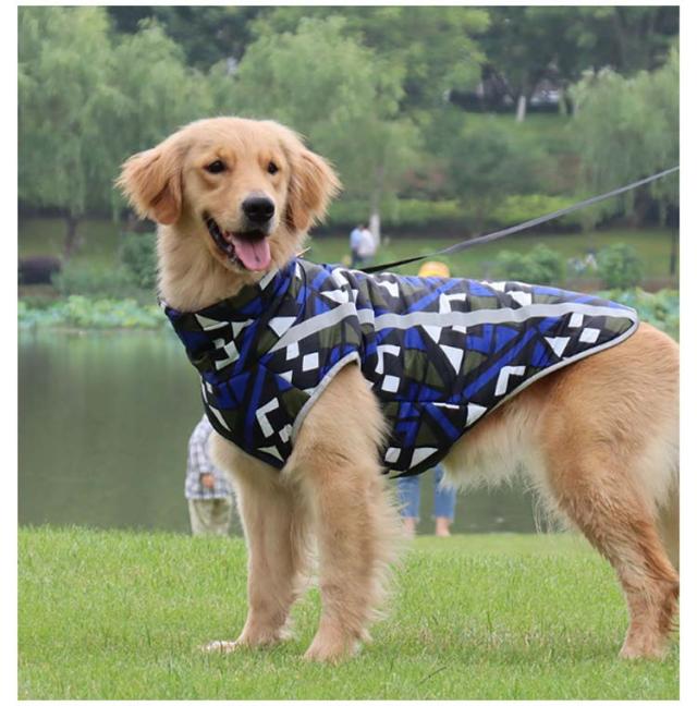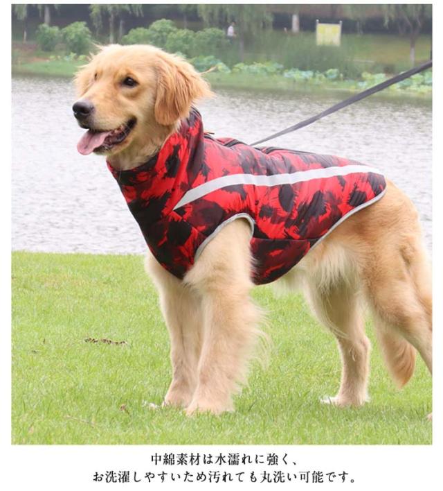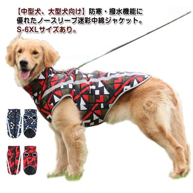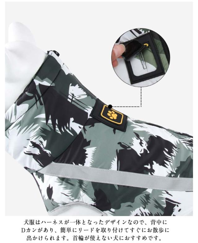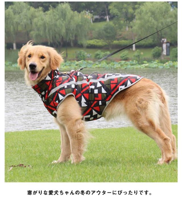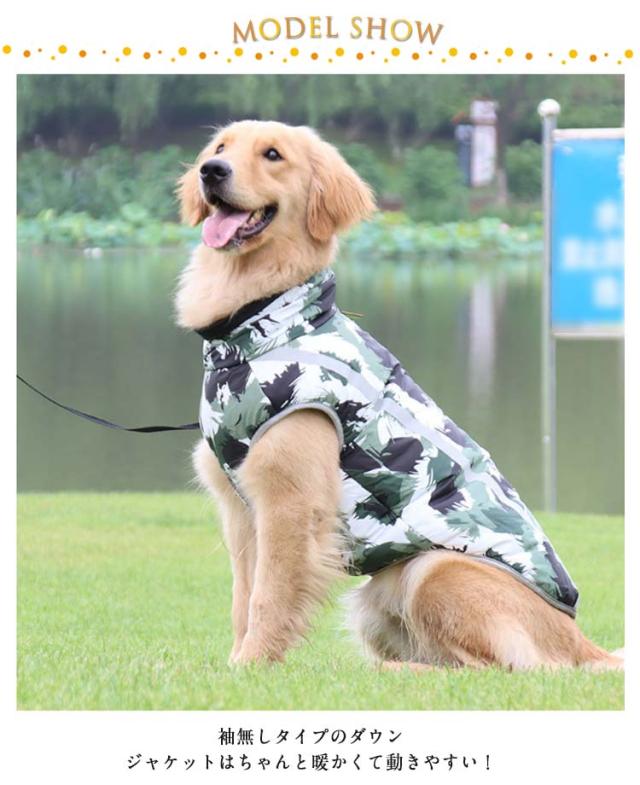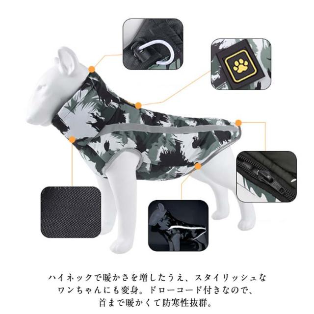 背中開き S-6XL! 着脱簡単 袖なし コート ハーネス 迷彩柄 中綿 幾何学柄 大型犬 向け ジャケット ハイネック ダウン ドッグウェア 中型犬 秋 冬 服 軽量 防水 犬服 犬用 撥水 背中ファスナー ジャンパー S-6XL! 冬服 防寒 暖かい
