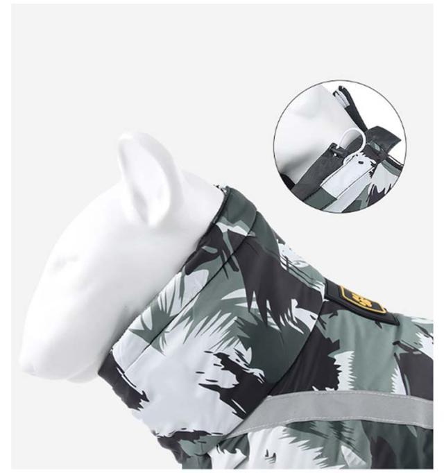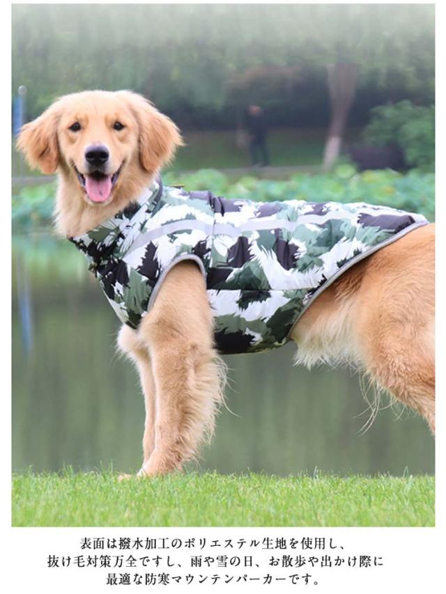 | 【中型犬、大型犬向け】防寒・撥水機能に優れたノースリーブ迷彩中綿ジャケット。S-6XLサイズあり。 表面は撥水加工のポリエステル生地を使用し、抜け毛対策万全ですし、雨や雪の日、お散歩や出かけ際に最適な防寒マウンテンパーカーです。 防風防寒性に優れた中綿入りなので、暖かくて防寒対策も万全。寒くて冷える時期のお出掛けに最適!お散歩やお出掛けが楽しくなること間違いなし♪ ハイネックで暖かさを増したうえ、スタイリッシュなワンちゃんにも変身。ドローコード付きなので、首まで暖かくて防寒性抜群。 犬服はハーネスが一体となったデザインなので、背中にDカンがあり、簡単にリードを取り付けてすぐにお散歩に出かけられます。首輪が使えない犬におすすめです。 バックジッパー式、着替える安くて脱着が簡単なデザインです。 袖無しタイプのダウンジャケットはちゃんと暖かくて動きやすい! 中綿素材は水濡れに強く、お洗濯しやすいため汚れても丸洗い可能です。 寒がりな愛犬ちゃんの冬のアウターにぴったりです。 | |