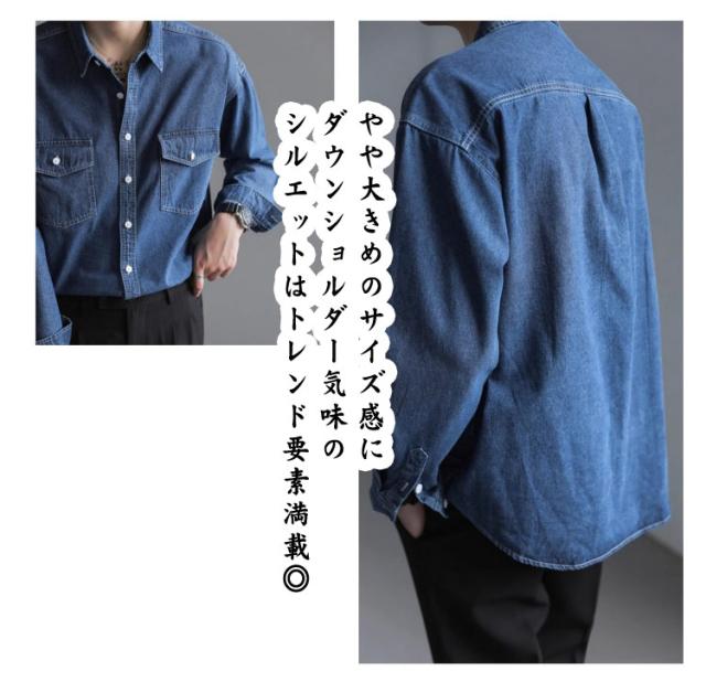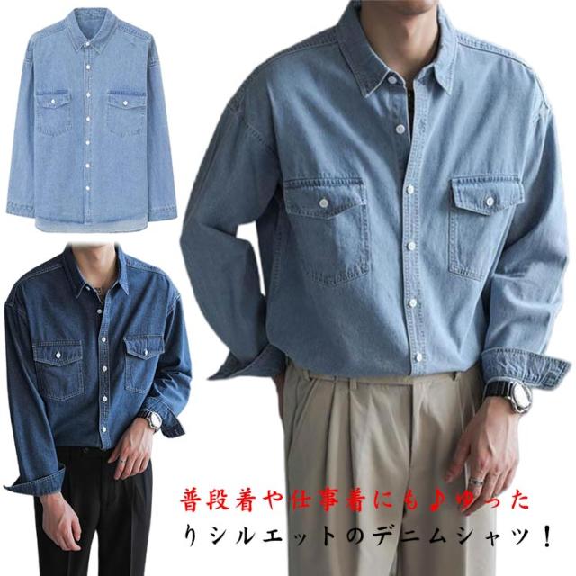 カジュアル デニム メンズ シャツ 無地 長袖シャツ オーバーサイズ ウォッシュ加工 デニムシャツ デニムシャツ 綿 羽織り ブルー 男性 男 シンプル 重ね着 デニム 前開き 襟付き かっこいい ボタン 秋冬