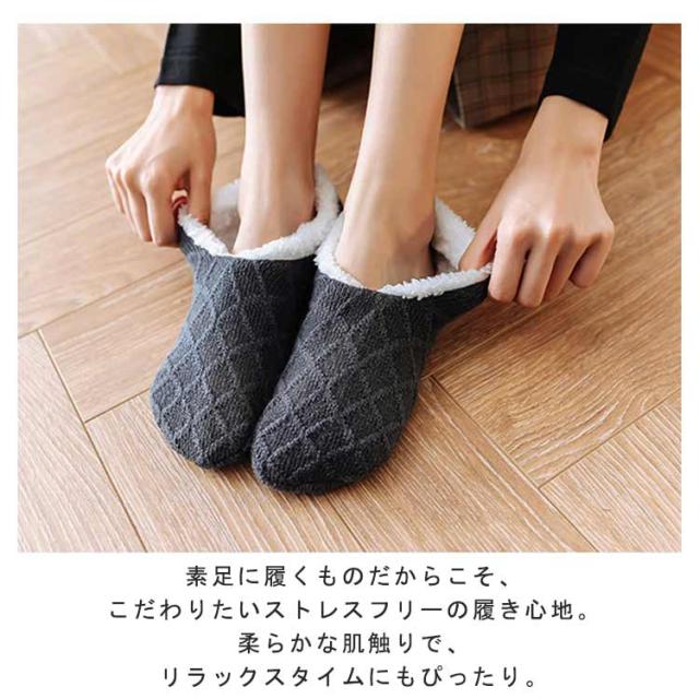 | ふわふわ・もこもこで秋冬にぴったりのシューズタイプのルームソックス。 ケーブル編みのニットと裏起毛の二重構造で寒い日にも足元を暖かく守ります。 ふかふかの裏起毛素材で、まるで履く毛布のような暖かさ、つま先までしっかり保温してくれます。 足裏には滑り止め付きなのでフリーリングでも滑りにくく安心。 お家でのリラックスタイムや就寝時の足元の冷え対策など、冬を快適にポカポカお過ごし頂きます。 全体的にやや伸縮性があるので履きやすく、優しく足元をあたためてくれるので、の方はもちろん、温活や、妊活中・妊娠中の方にもおすすめ。 | |