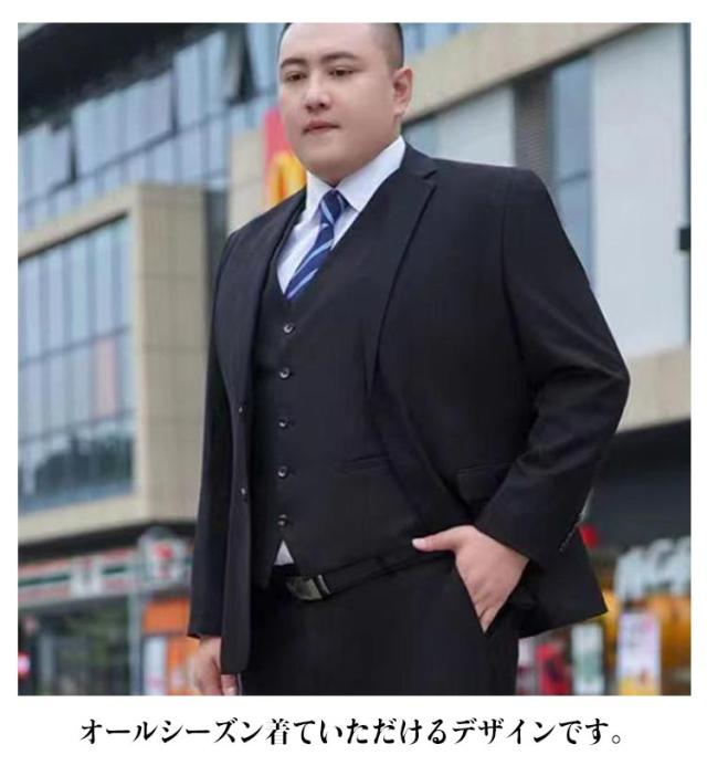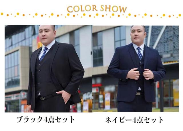 | サイズについての説明 | 【4点セット内容】ジャケット、パンツ、シャツ、ネクタイ 【ジャケットサイズ】 【M】 着丈70cm バスト106cm 袖丈60.5cm 目安体重60-67.5kg 【L】 着丈72cm バスト110cm 袖丈62cm 目安体重67.5-72.5kg 【XL】 着丈74cm バスト114cm 袖丈63cm 目安体重72.5-80kg 【2XL】 着丈76cm バスト118cm 袖丈64cm 目安体重80-87.5kg 【3XL】 着丈76cm バスト122cm 袖丈64.5cm 目安体重87.5-92.5kg 【4XL】 着丈78cm バスト126cm 袖丈64.5cm 目安体重92.5-100kg 【5XL】 着丈78cm バスト130cm 袖丈64.5cm 目安体重100-107.5kg 【6XL】 着丈78cm バスト136cm 袖丈64.5cm 目安体重107.5-115kg 【7XL】 着丈80cm バスト140cm 袖丈65cm 目安体重115-122.5kg 【8XL】 着丈80cm バスト144cm 袖丈65cm 目安体重122.5-132.5kg 【9XL】 着丈82cm バスト150cm 袖丈66.5cm 目安体重132.5-145kg 【パンツサイズ】 【M】 ウェスト80cm ヒップ98cm ワタリ幅63cm 【L】 ウェスト84cm ヒップ101.2cm ワタリ幅64.8cm 【XL】 ウェスト88cm ヒップ104.4cm ワタリ幅66.6cm 【2XL】 ウェスト93cm ヒップ108.8cm ワタリ幅68.85cm 【3XL】 ウェスト98cm ヒップ112.4cm ワタリ幅71.1cm 【4XL】 ウェスト103cm ヒップ116.4cm ワタリ幅73.35cm 【5XL】 ウェスト108cm ヒップ123.7cm ワタリ幅77.3cm 【6XL】 ウェスト113cm ヒップ128.5cm ワタリ幅80cm 【7XL】 ウェスト118cm ヒップ131.7cm ワタリ幅81.8cm 【8XL】 ウェスト123cm ヒップ138.1cm ワタリ幅85.4cm 【9XL】 ウェスト128cm ヒップ139.7cm ワタリ幅87.2cm ※サイズ感 |