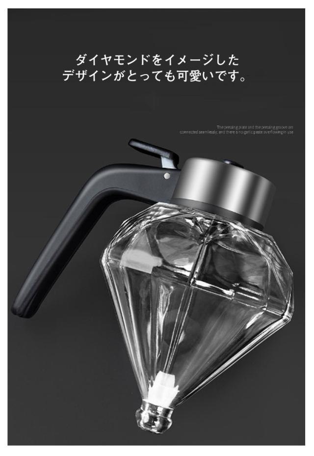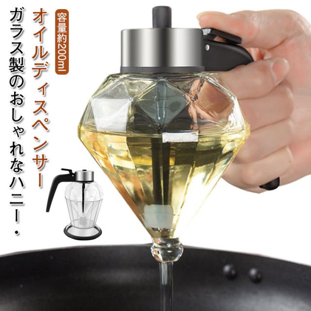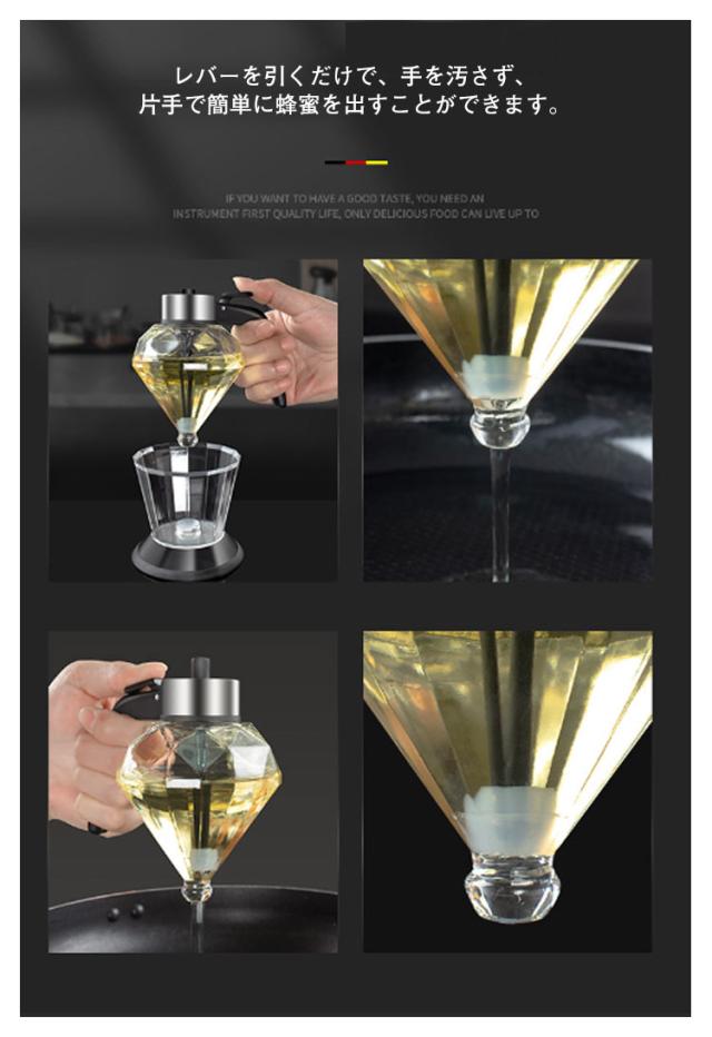 | ガラス製のおしゃれなハニー・オイルディスペンサー 機能的なだけでなく、デザインもとってもお洒落なハニーディスペンサーです! ダイヤモンドをイメージしたデザインがとっても可愛いです。 レバーを引くだけで、手を汚さず、片手で簡単に蜂蜜を出すことができます。 滑り止めシリコンリング付き、使用時に滑りにくく、しっかりと置くことができる。 使用後は付属の台に収納。テーブルを汚す心配もありません。 食パン、ホットケーキ、ヨーグルトなどなど、はちみつを使うシーンで大活躍。 はちみつの美味しさを見た目で引き立てるばかりでなく、食卓もお洒落に演出します。 | |