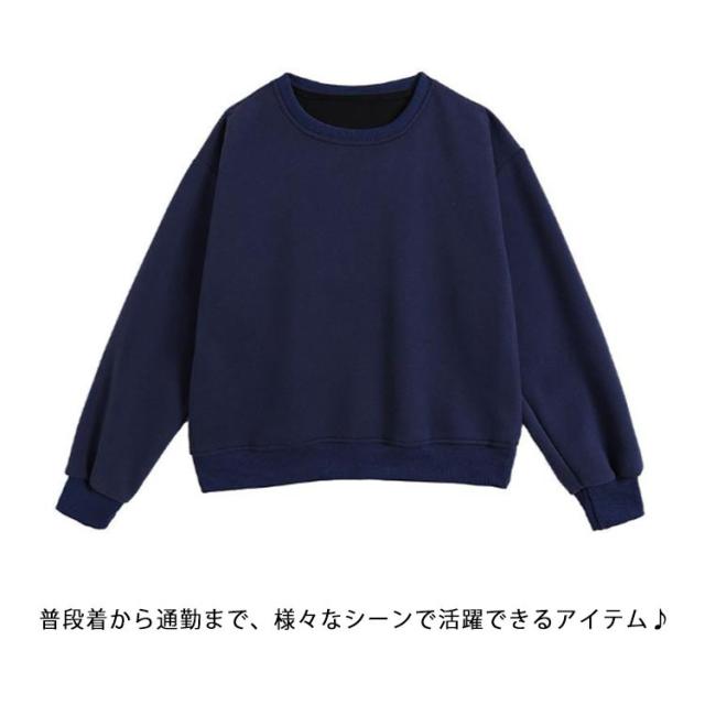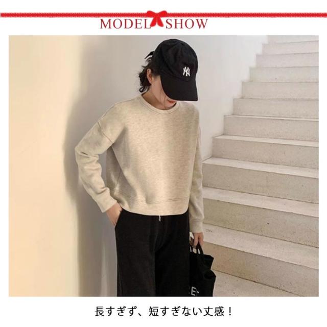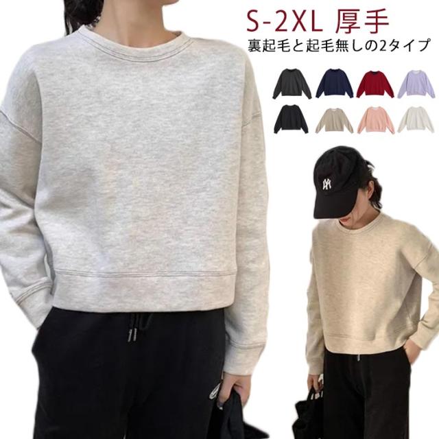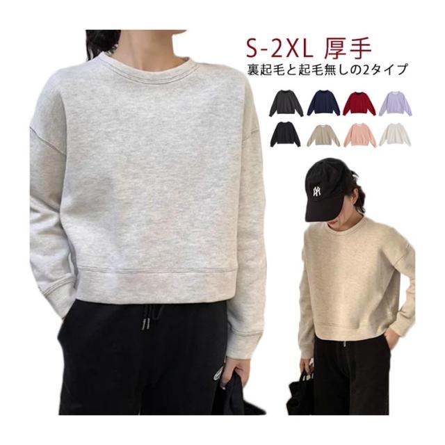 ショート丈 プルオーバー レディース 丸首 カットソー トレーナー トレーナー トレーナー 裏起毛と起毛無しの2タイプ 長袖 ショート 厚手 防寒 ドロップショルダー ワイドシルエット クルーネック
